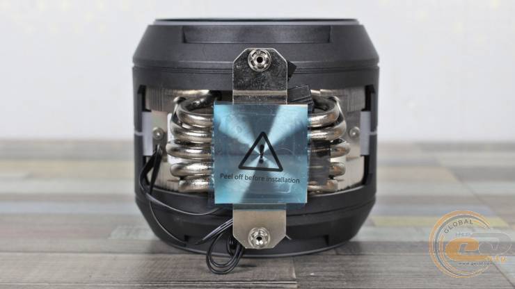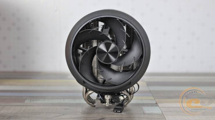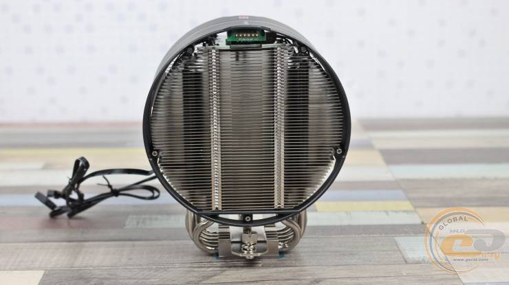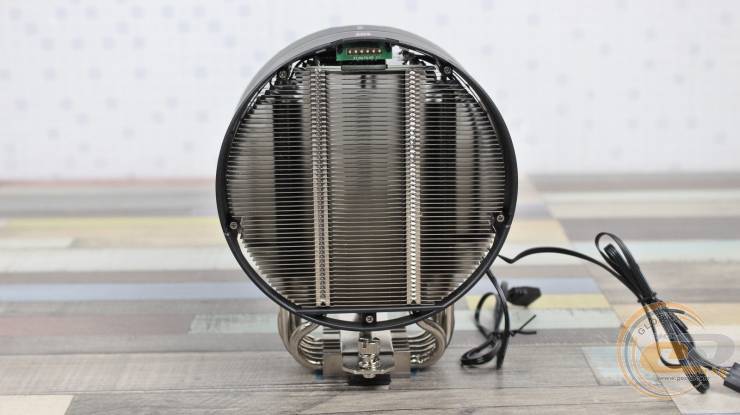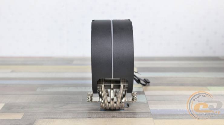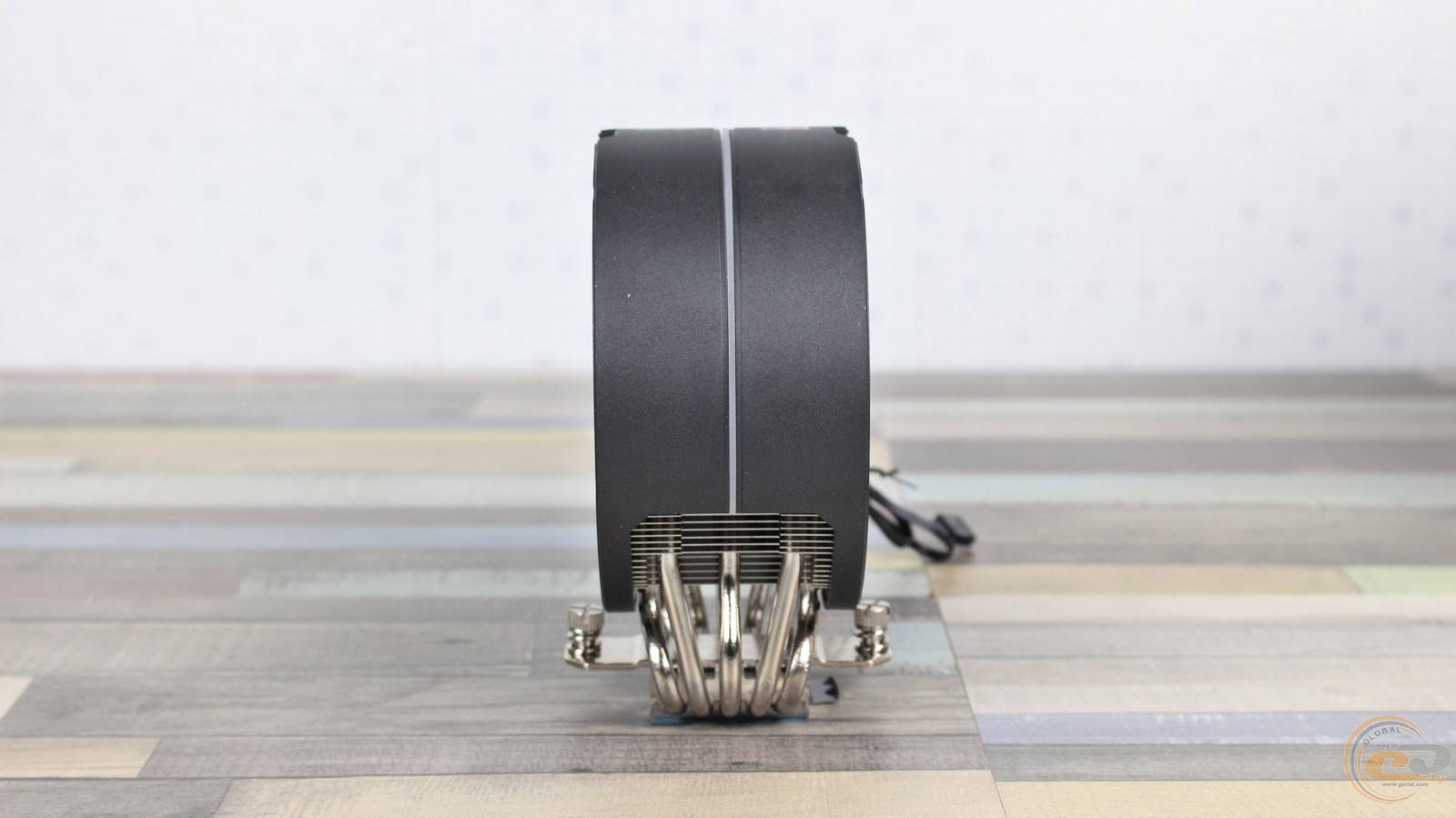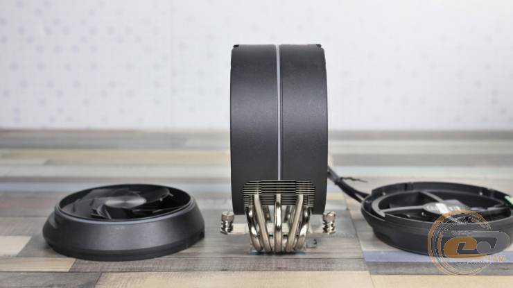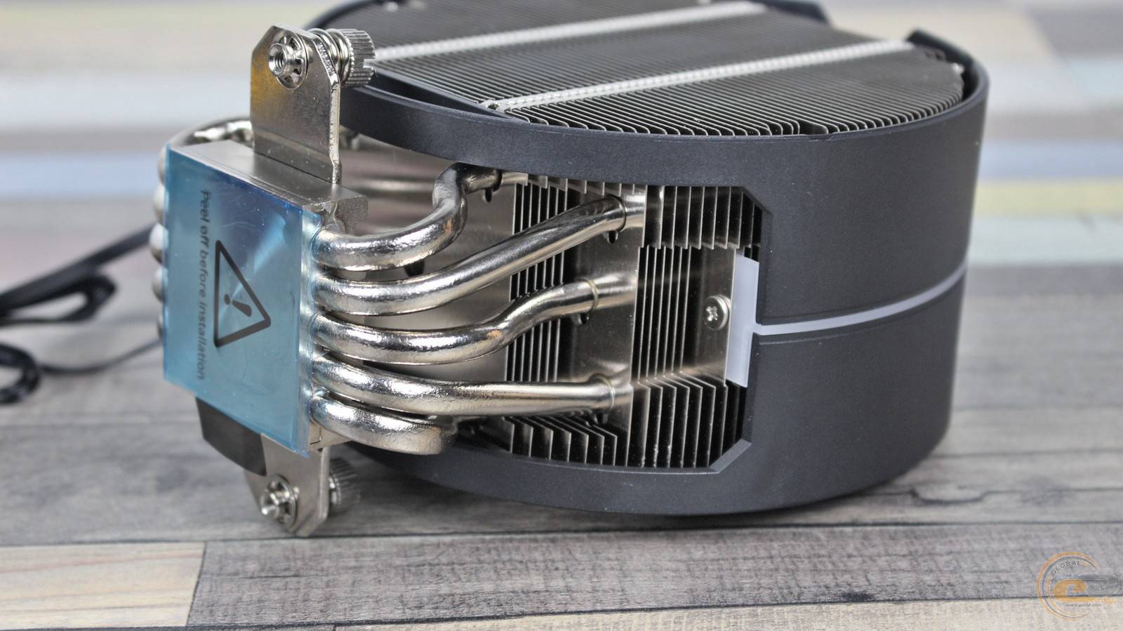 Пластины нанизаны на пять 6-мм никелированных медных тепловых трубок. Для повышения эффективности производитель применил дополнительные изгибы трех из них, что позволяет более равномерно распределять тепло по радиатору. Сверху конструкцию накрывает кожух из матового пластика с легкой шероховатостью и мелким рифлением. Он фиксируется двумя винтами, придавая завершенности и аккуратности внешнему виду.