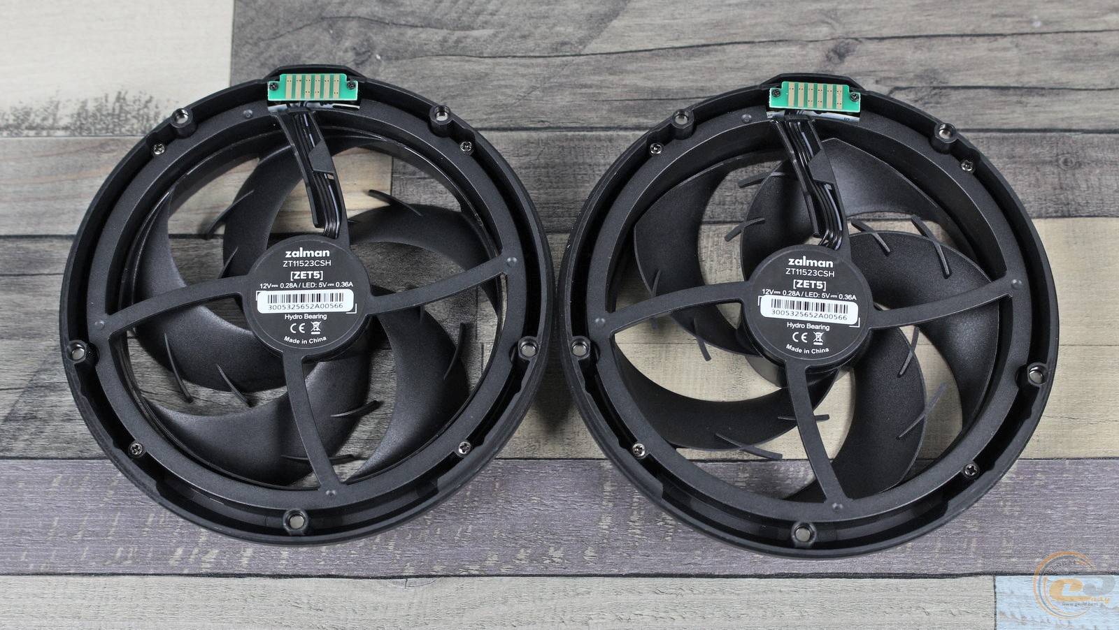 Два вентилятора ZALMAN ZT11523CSH получили необычную круглую рамку, гармонично соответствующую форме радиатора. Их диаметр составляет 115 мм, а толщина – 23 мм. Несмотря на внешнее сходство, они несколько отличаются: один из них реверсивный, что логично для организации сквозного продувания. В конструкции использованы гидравлические подшипники с ресурсом 40 000 часов.