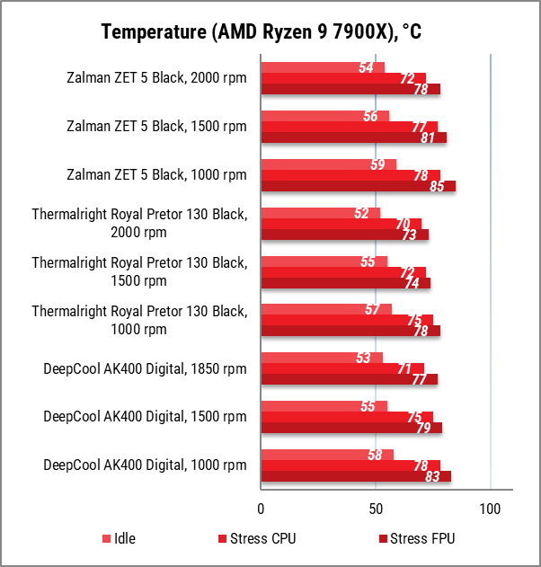 В нашем сравнении кулер ZALMAN ZET 5 BLACK показал самые низкие результаты, уступив даже одновентиляторному DeepCool AK400 DIGITAL. Впрочем, учитывая уменьшенную ради дизайна площадь радиатора и диаметр вентиляторов 115 мм, это вполне ожидаемо.