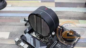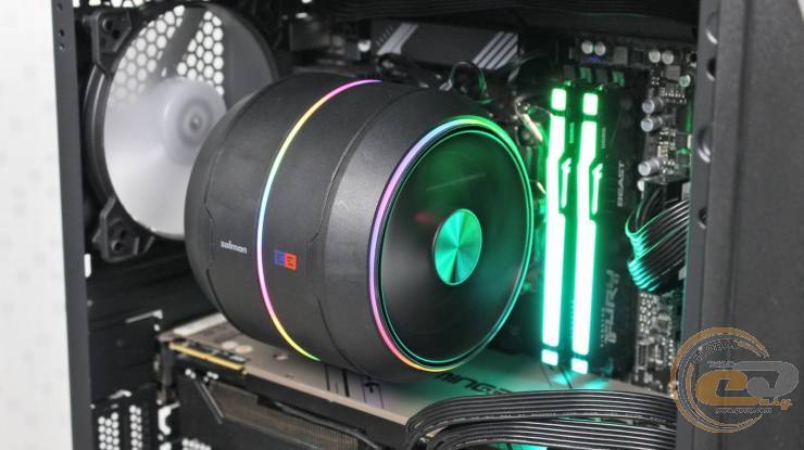 Внешне радиатор с вентиляторами смотрится как одно целое. Магнитный крепеж значительно упрощает сборку, а в целом процесс монтажа очень прост. При этом три кольца подсветки создают яркий визуальный эффект. Впрочем, существует ограничение по высоте модулей памяти – в первый слот можно установить модуль высотой до 42 мм.