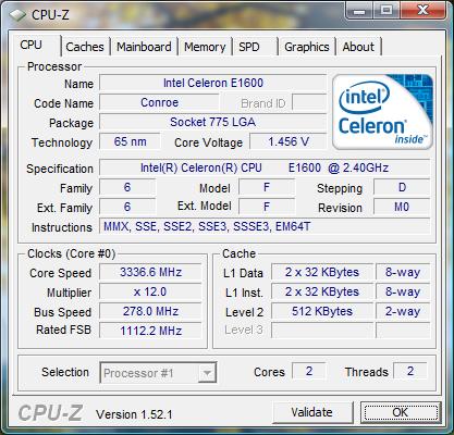 Стабильная работа зафиксирована всего-то на отметке опорной шины в 278 МГц. Это дало возможность получить тактовую частоту всего 3336 МГц, что на 39% выше номинальной. Напряжение питания ядра пришлось увеличить с 1,264 В, до 1,456 В. Учитывая, что ранее тестируемые, более медленные модели смогли в свою очередь разогнаться до 3040 МГц, 3360 МГц, 3300 МГц, при напряжениях питания 1,396 В, 1,456 В, 1,568 В соответственно, тестируемый сегодня процессор Intel Celeron Dual-Core E1600 выступил «в рамках приличия» и оказался солидарен со своими «младшими братьями».