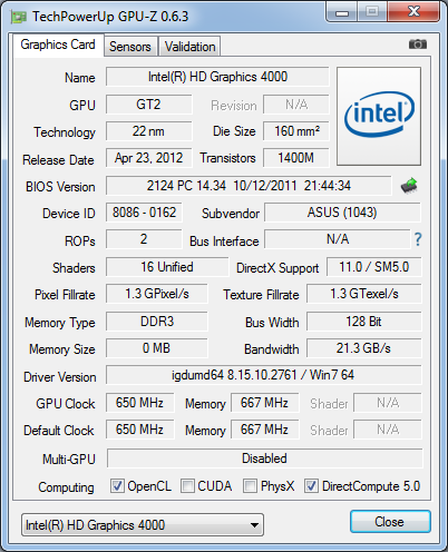 Для определения производительности графического ядра Intel HD Graphics 4000 была выполнена серия тестов.