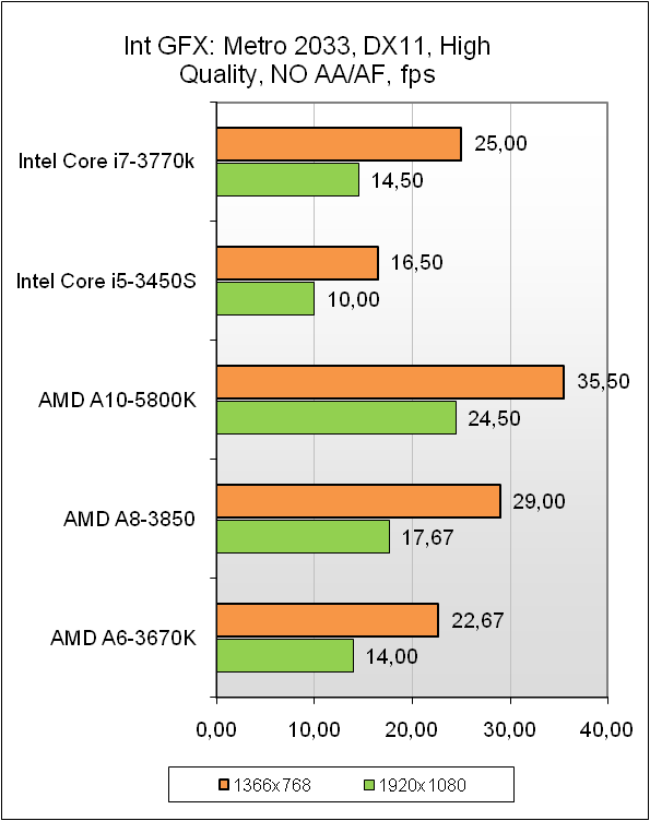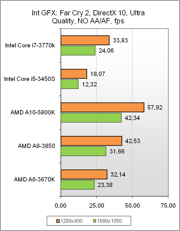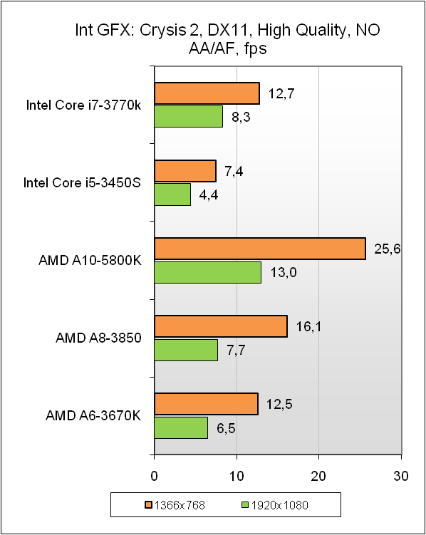 По результатам тестов заметно, что подобная переработка графического ядра не прошла бесследно. Новинка вполне успешно конкурирует с топовыми AMD APU предыдущего поколения. При некотором отставании, Intel HD Graphics 4000 всё же демонстрирует неплохую работоспособность даже в игровых приложениях с набором инструкций DirectX 11, но рассчитывать на комфортный уровень игры в современных играх стоит исключительно при малых разрешениях экрана да и то не всегда. В остальном же новинка отлично справляется с традиционными задачами, которые стоят перед мультимедийным ПК, особенно если учесть, что при соответствующей материнской плате можно подключить вплоть до 3-х мониторов. В целом новое графическое ядро станет отличным помощником при сборке высокопроизводительных вычислительных систем или же серверов крупных корпоративных сетей. Для остальных задач стоит доукомплектовать систему современной дискретной видеокартой с соответствующей вашим требованиям производительностью.