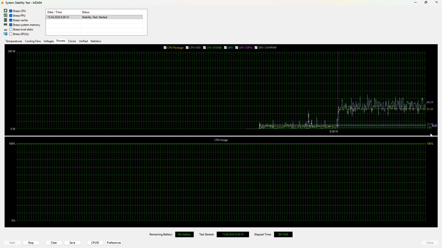 Если задействовать главный и графический процессор, то показатели температур второго почти не изменяются, а вот CPU разогревается почти до 70 градусов Цельсия, а его частоты достигают примерно 4150 МГц.