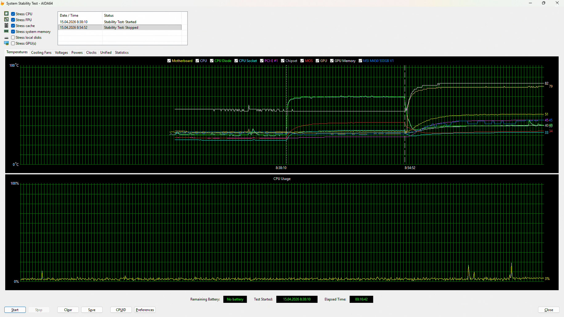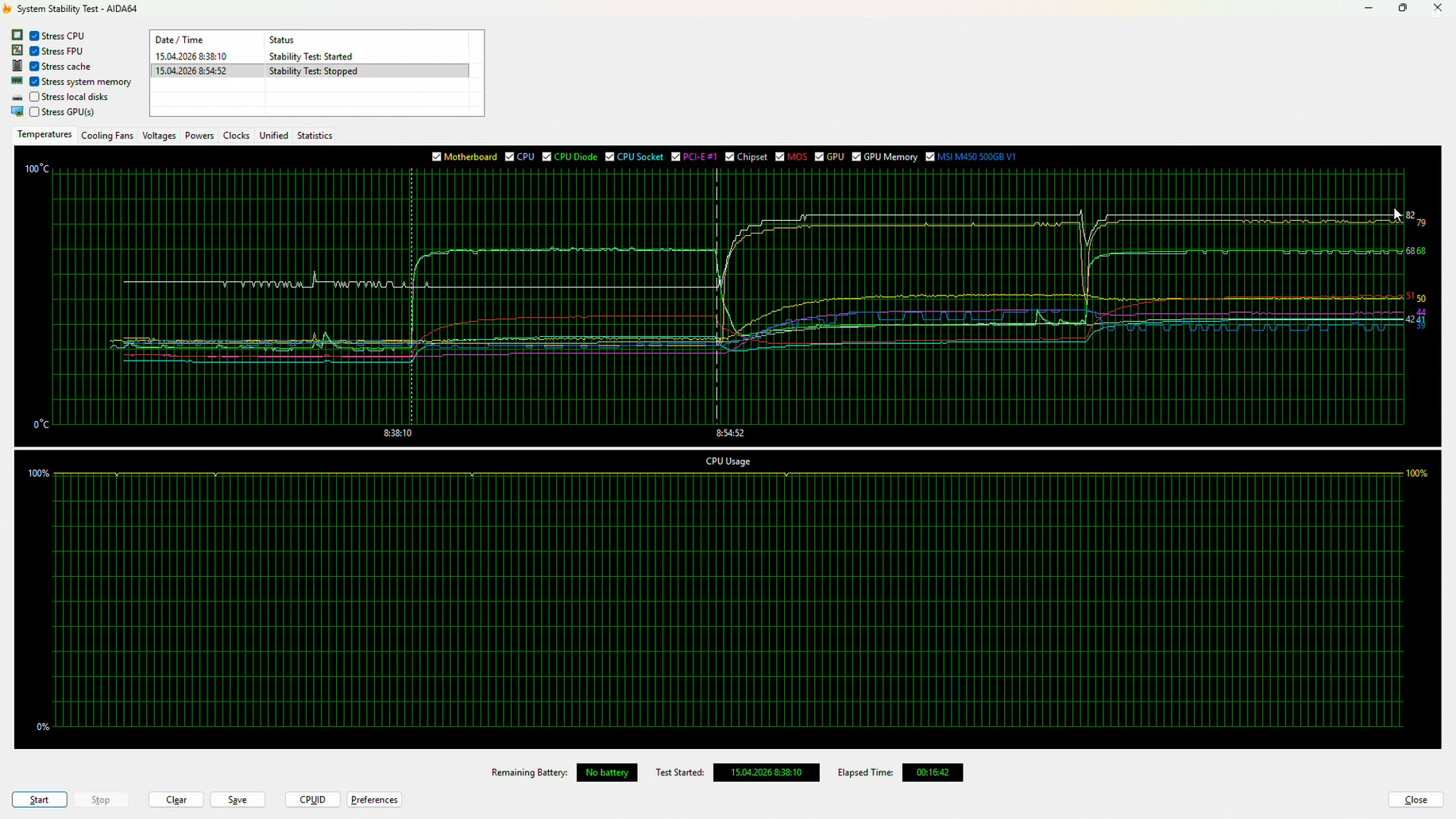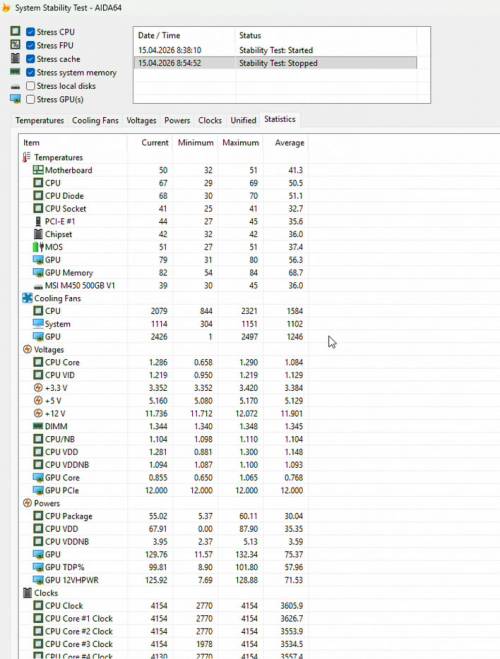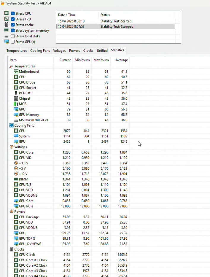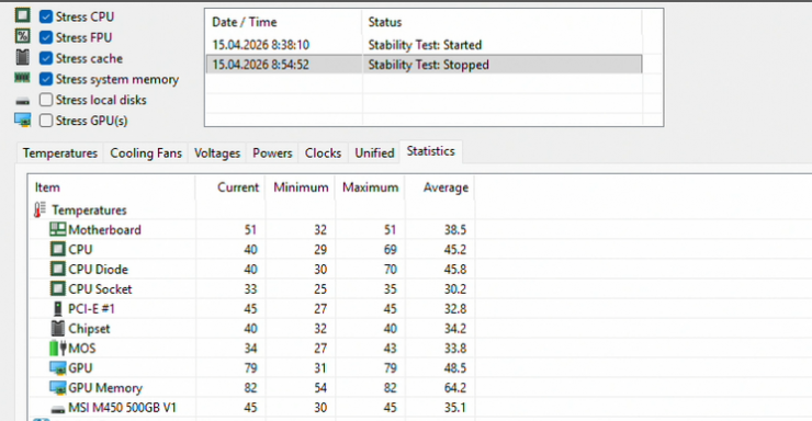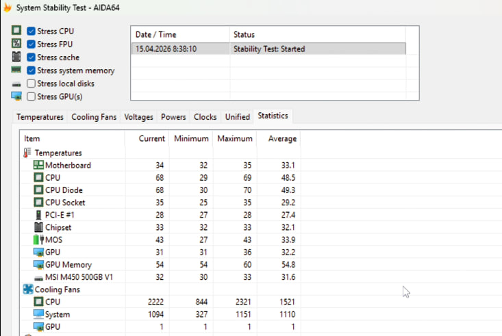 Комплексная нагрузка на процессор, кэш и память в AIDA64 заставила его нагреться CPU до 69 градусов, а кулер на нем начал работать почти на максимуме, раскрутившись до 2250 оборотов в минуту, что привело к заметному жужжанию.