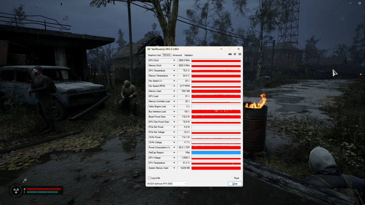 Во время игры в S.T.A.L.K.E.R. 2: Heart of Chornobyl видеокарте стало чуть-чуть холоднее и ее температурные показатели упали до 75,5 градусов, хотя чипы памяти все еще держали планку в 84°C, а вот частота работы уже подпрыгнула почти до 2900 МГц.