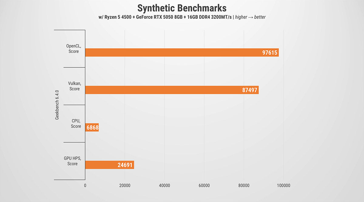 3DMark подтверждает ожидаемую картину: трассировка лучей дается тяжелее, но остается в пределах нормы для RTX 5050, тогда как классические растровые сцены обрабатываются более уверенно. В Geekbench ситуация аналогичная – процессор и видеокарта показывают стабильные, прогнозируемые результаты без проседаний или аномалий.