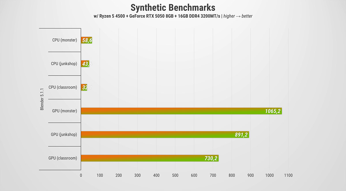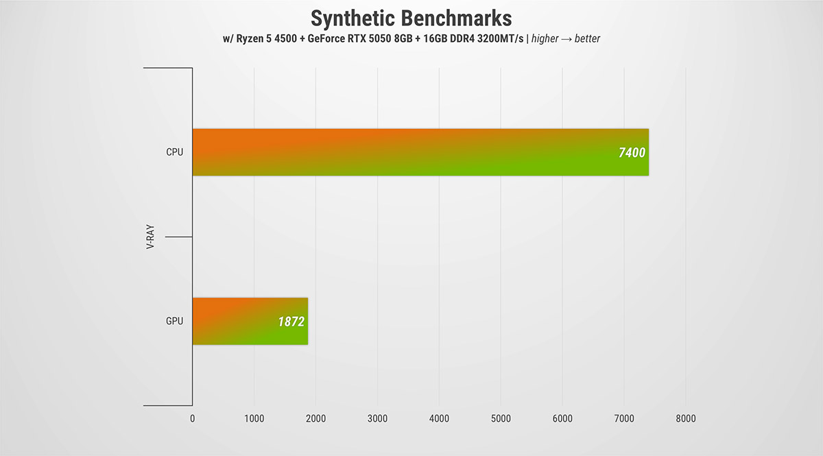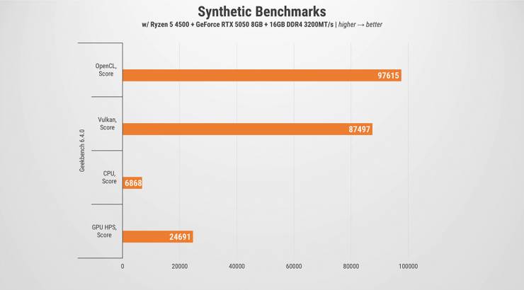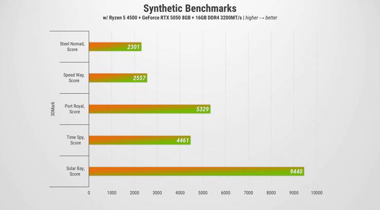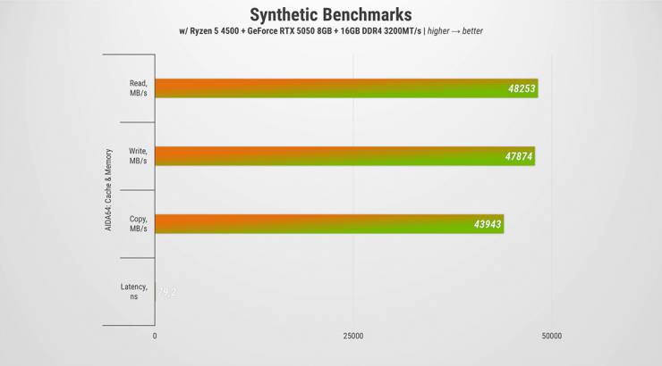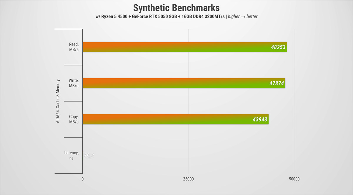В синтетических тестах система AMD Ryzen 5 4500 и GeForce RTX 5050 8GB демонстрирует абсолютно типичный для своего класса уровень производительности. Результаты, показанные процессором находятся несколько ниже среднего уровня, а видеокарта продемонстрировала хорошие показатели, как и ожидалось от представительницы последней линейки.