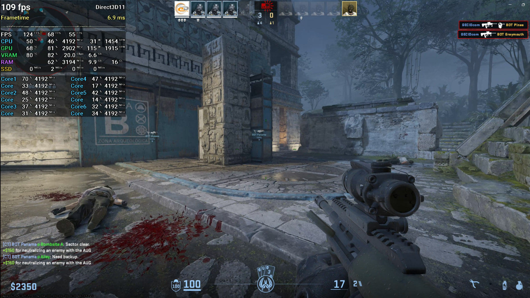 В Counter Strike 2, в которой часто игроки предпочитают производительность чем хорошую картинку, даже на очень высоких настройках счетчик частоты кадров практически всегда показывает значение выше 120, а иногда подскакивает и выше. Однако показатель очень редких событий стабильно находится в значениях вдвое меньше среднего результата. Это может привести к незначительным подергиваниям, которые все же будут следствием оптимизации игры или недостатка производительности процессора.