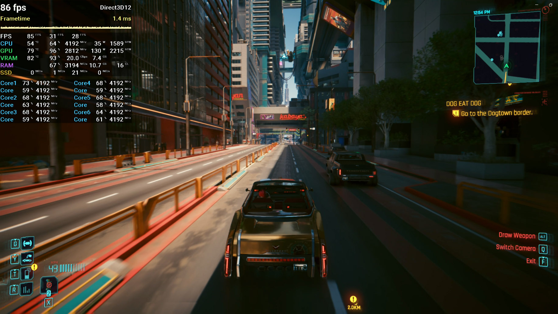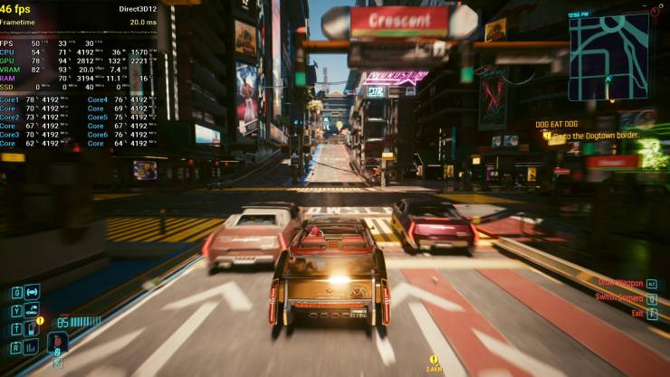 В Cyberpunk 2077 даже на минимальных настройках трассировки лучей эта конфигурация позволяет увидеть базовые RT-эффекты – освещение, отражение и более реалистичные тени придающие сценам глубины. Впрочем, дается этой системе уже не так легко: чувствуется ограничение, как со стороны видеопамяти, так и процессора.