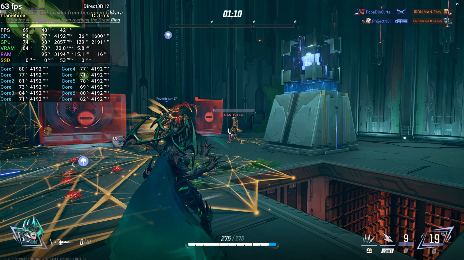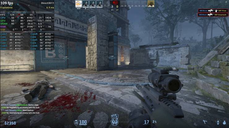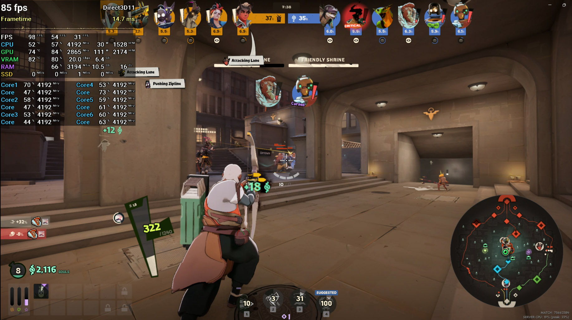 В Deadlock разработчики постоянно работают над обновлениями, иногда по-разному влияющими на производительность, но сейчас игра относится к достаточно доступным. Как видим, всех ресурсов в виде VRAM, RAM и возможностей CPU предостаточно, чтобы получить почти сотню FPS даже во время боя 4 на 4 в одной точке.