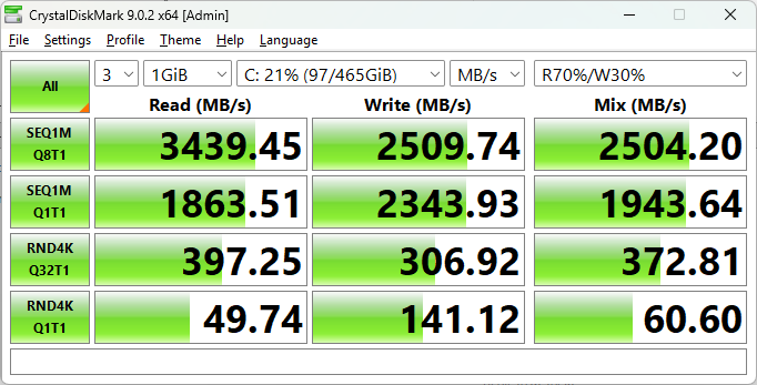 Для хранения системы и игр используется SSD MSI SPATIUM M450 объемом 500 ГБ в формате M.2 с поддержкой PCIe 4.0 x4. Это приятный момент, ведь даже в доступном ПК имеется не SATA-решение, а современный NVMe-накопитель. Он обеспечивает быстрый запуск Windows, оперативную загрузку программ и комфортный старт игр. Другой вопрос – сам объем. Пол терабайта сегодня уже не выглядят большим запасом, особенно если речь идет о нескольких тяжелых ААА-проектах одновременно. То есть по скорости все хорошо, а вот по емкости пользователь рано или поздно может задуматься о расширении. Тестирование в CrystalDiskMark показывает скорости на уровне ~3440 МБ/с на чтение и не более 2500 МБ/с на запись, что полностью соответствует ожиданиям от бюджетного NVMe PCIe 4.0 накопителя.