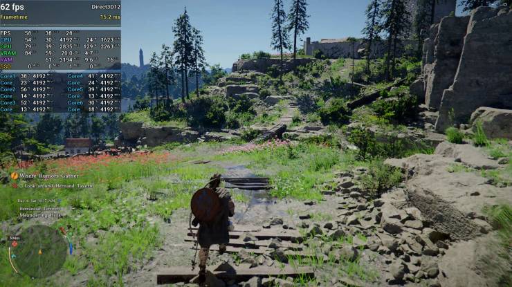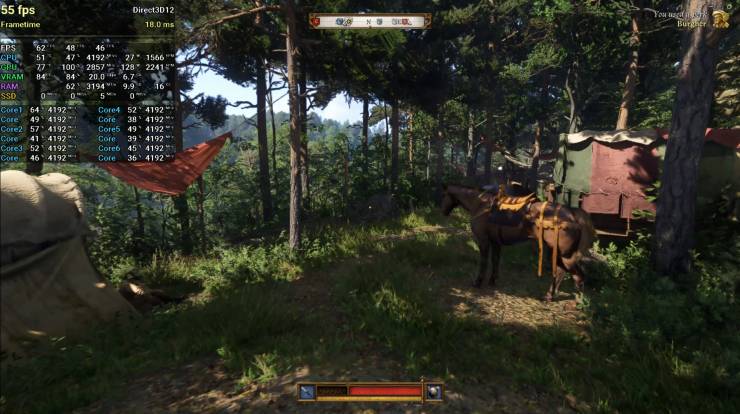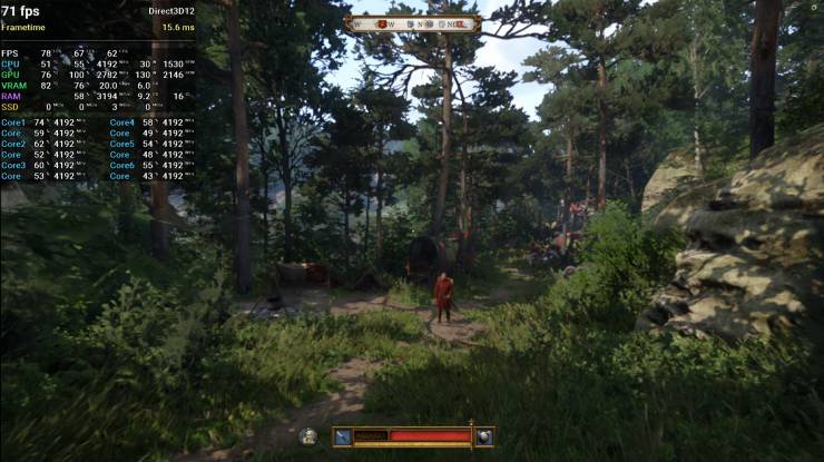 В Kingdom Come Deliverance II на высоких настройках система работает уверенно: передвижения по открытым локациям и «беготня по тропам» проходят максимально комфортно, с хорошим запасом по частоте кадров и без ощутимых проседаний.