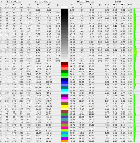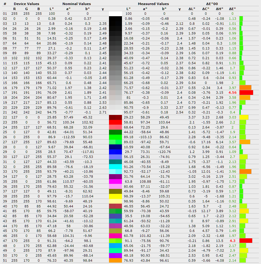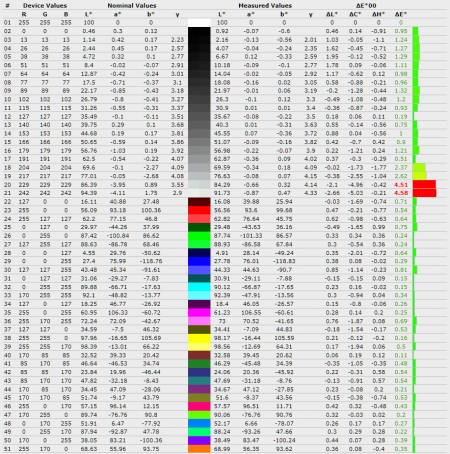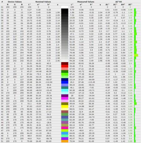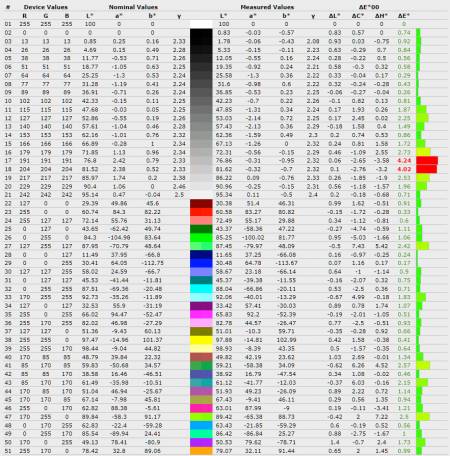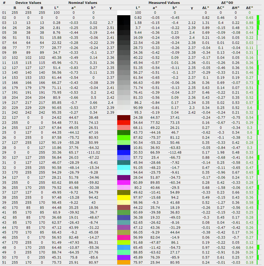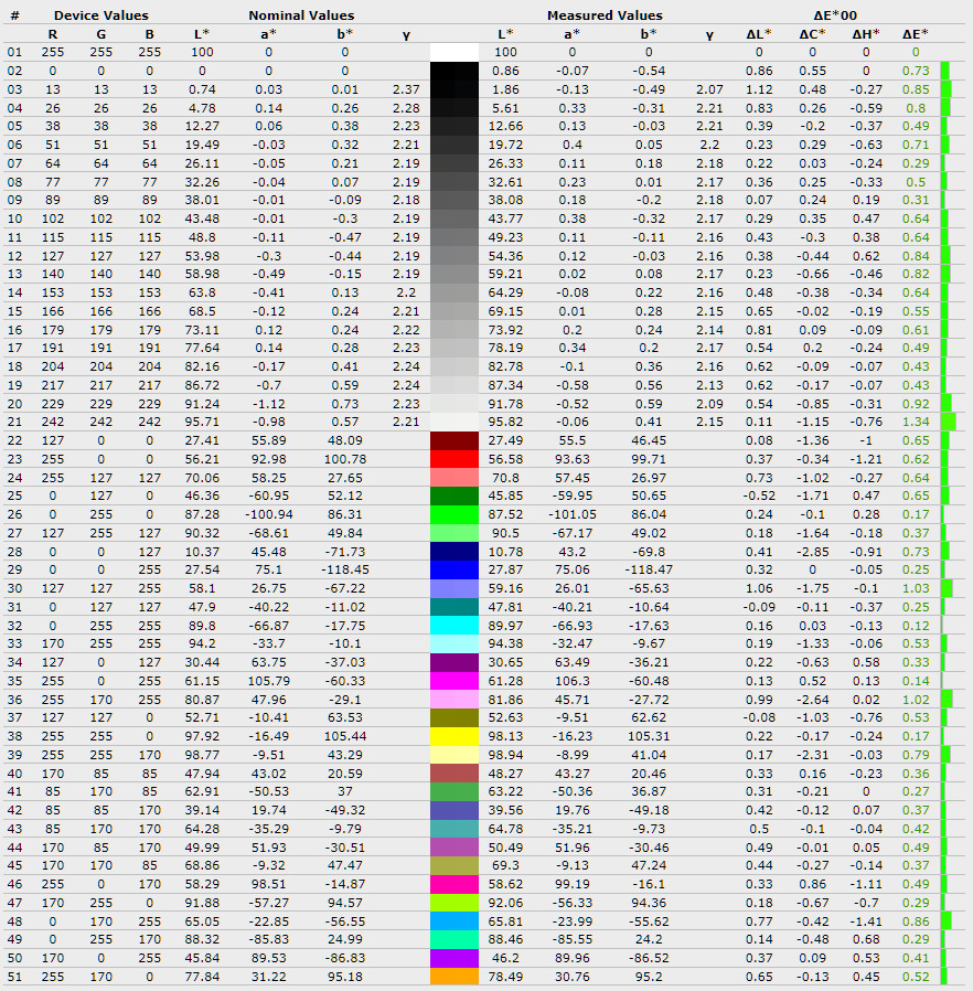 Среди отрицательных: уровень черного поля поднялся, что ухудшило глубину черного, а максимальное отклонение ΔE увеличилось от 0,88 до 1,52, снижая точность воспроизведения отдельных оттенков.