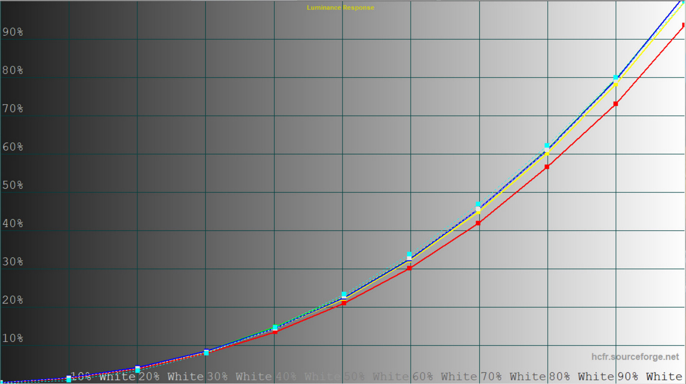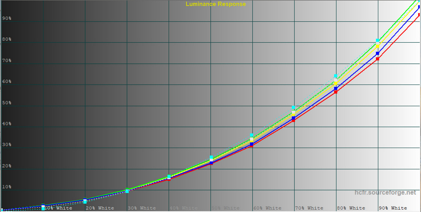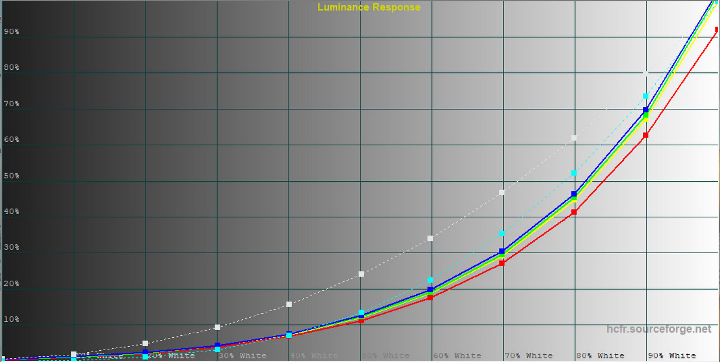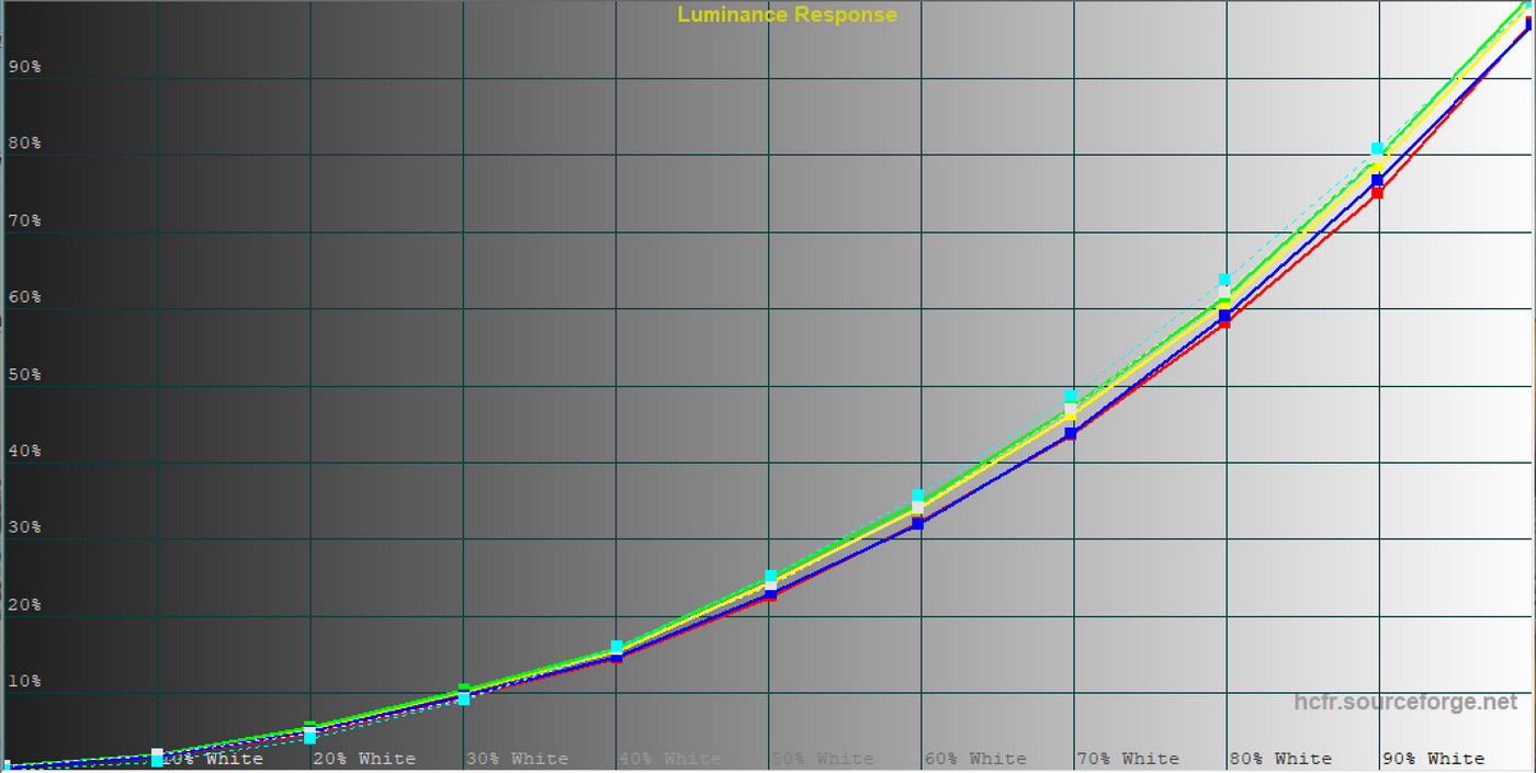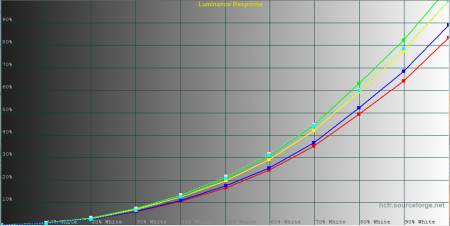 В профиле DICOM среднее значение гаммы достигает 2,91, а кривые проходят ниже эталонной. Это может привести к потере деталей в темных участках сцены, но такое поведение является специальной особенностью этого профиля, ведь он предназначен для просмотра медицинских изображений, где важно подчеркнуть контрастность в светлых участках.