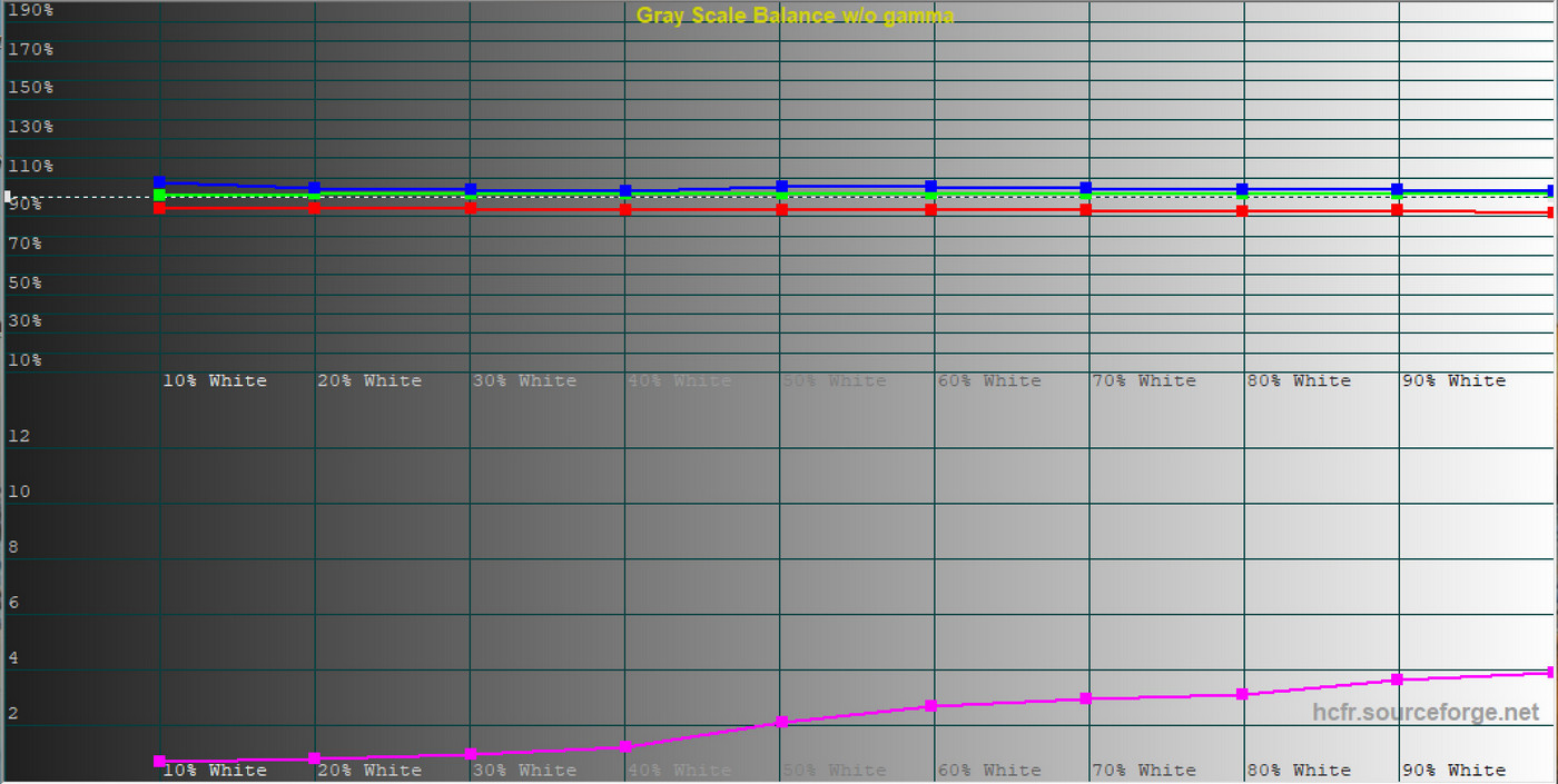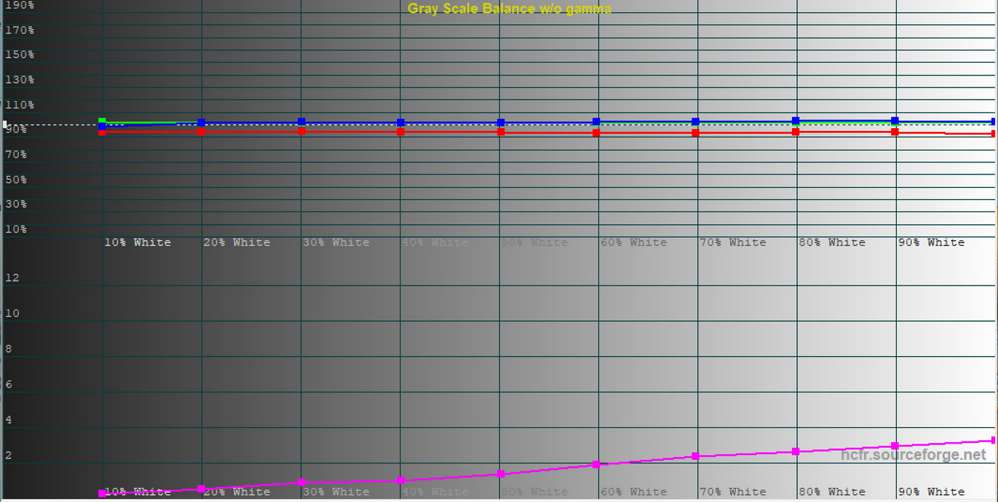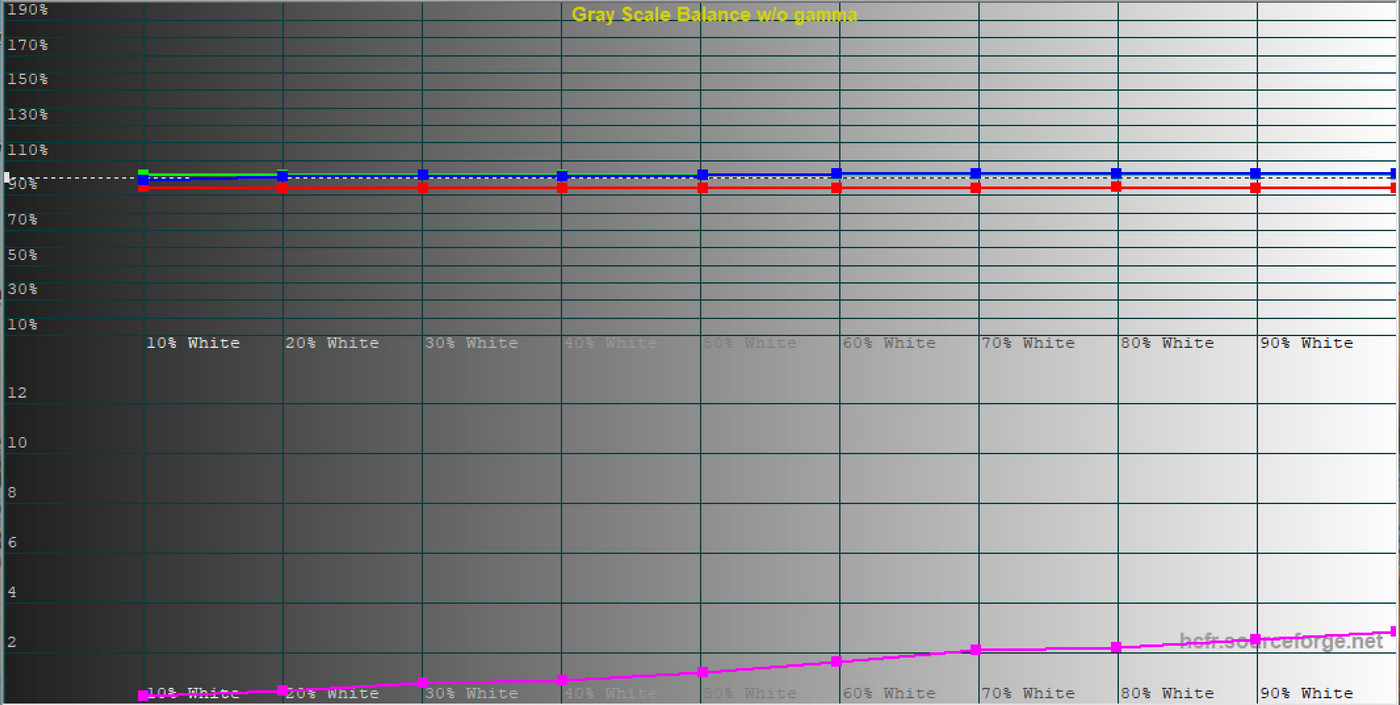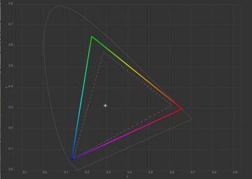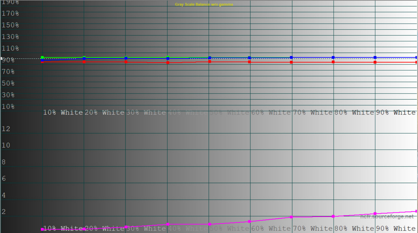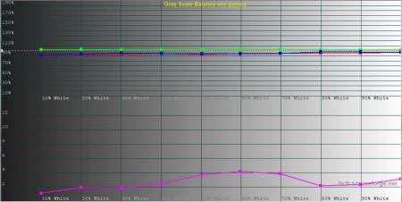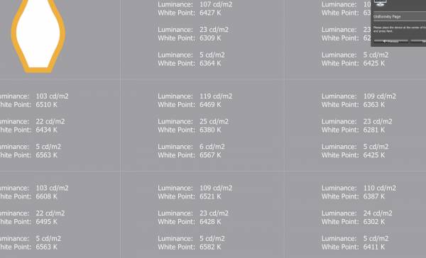 Отклонение температуры точки белого находится в пределах от –206 до +115 K, то есть вписывается в допустимый диапазон ±250 K. Это означает, что монитор сохраняет цветостабильность по всей плоскости экрана.
