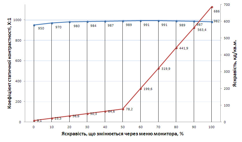 Яркость изменяется в широком диапазоне: от 9,1 кд/м² на минимуме до 686 кд/м² на максимуме. Минимальное значение позволяет комфортно работать ночью при организации фонового освещения, а максимальное даже превышает заявленные 600 кд/м², обеспечивая удобную работу в яркий солнечный день.