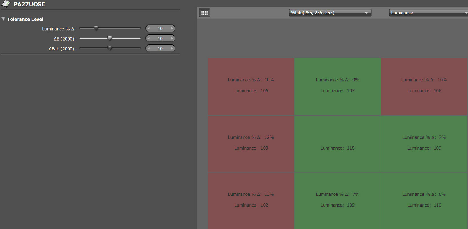 Лучшим в этом тесте считаются профили, где все три кривые находятся в диапазоне 100±10%. Наш PA27UCGE показал себя почти идеально: 6 из 7 профилей успешно прошли проверку, причем кривые практически ровные и держатся близко к 100%.