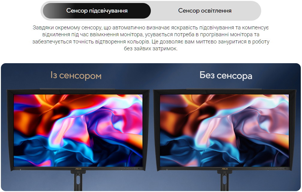 Сенсор подсветки автоматически контролирует яркость панели и компенсирует отклонения сразу после включения монитора, обеспечивая точность цвета без необходимости прогрева.