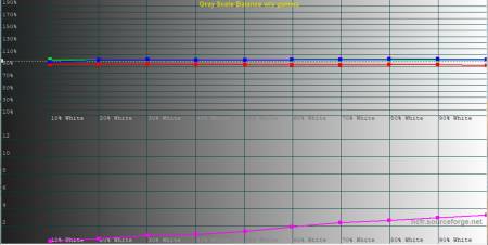 В профиле DCI P3 среднее значение гаммы составляет 2,08, кривая стабильная, но красная составляющая имеет более заметное отклонение от эталонной линии.