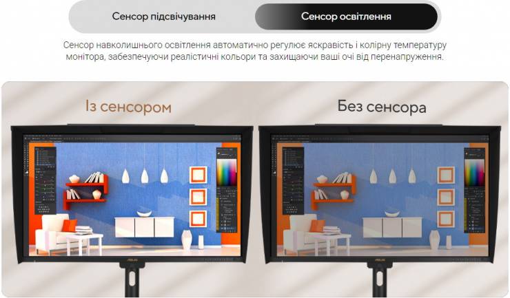 Монитор оснащен технологией ASUS Light Sync, которая включает в себя два сенсора - сенсор подсветки и сенсор окружающего освещения.