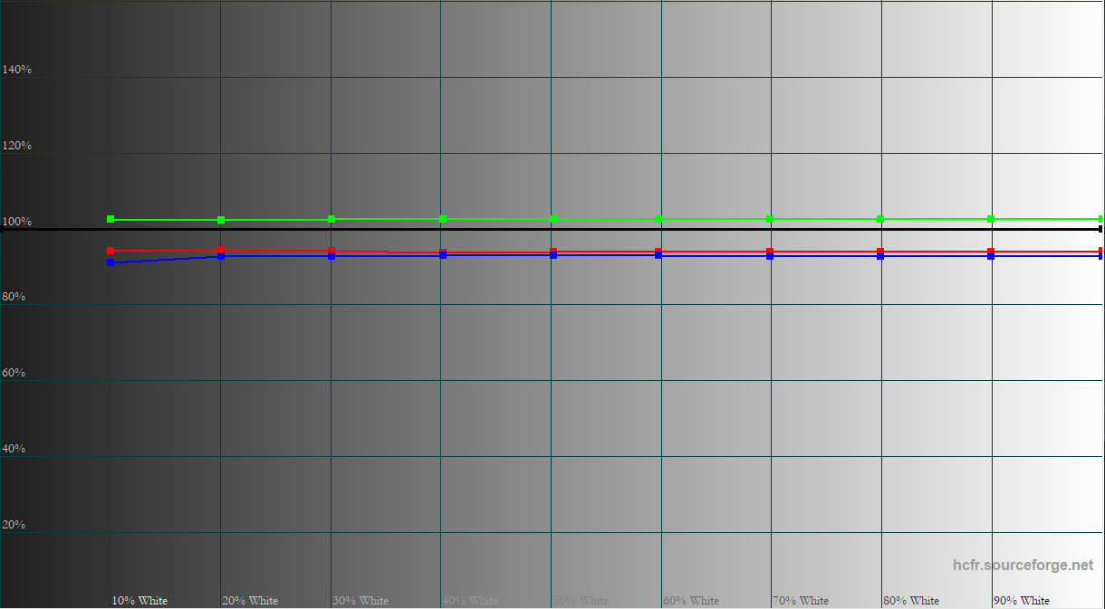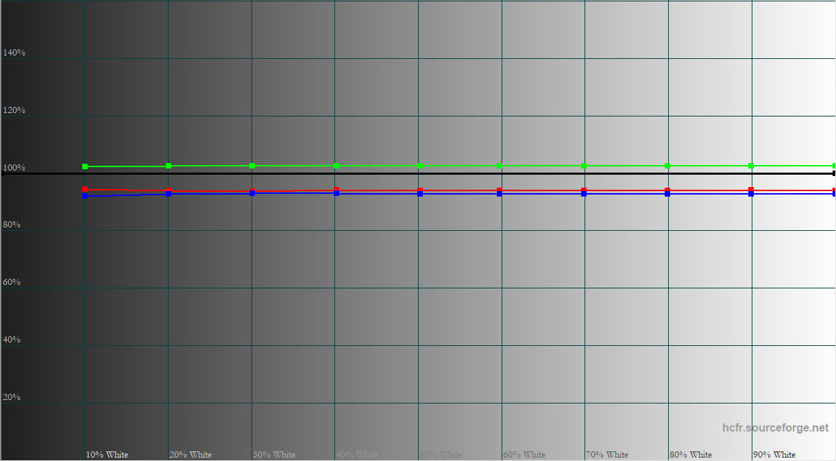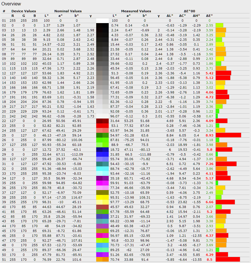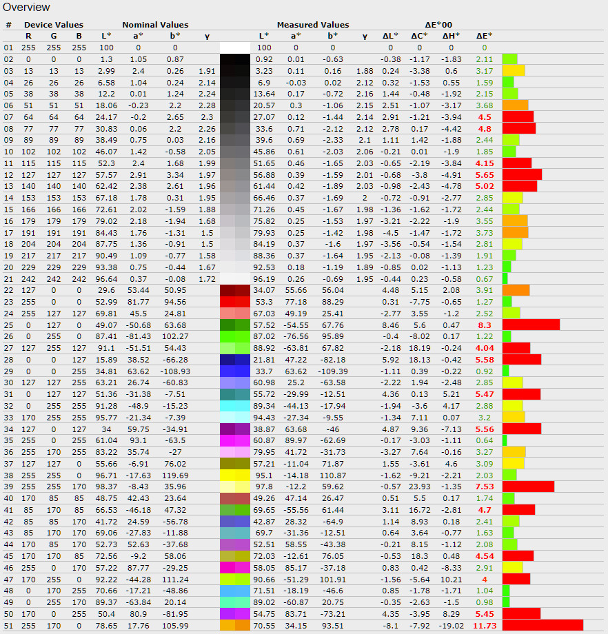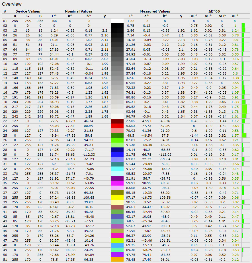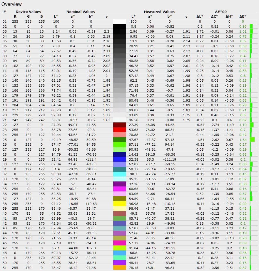 Среднее отклонение ∆E*94 уменьшилось до 0,44, максимальное – до 1,45, то есть оба показателя остаются в пределах профессиональных нормативов. Гамма-кривые выровнялись, приблизились к референсной, цветовые составляющие почти слились в одну кривую. Энергопотребление снизилось с 21 до 12 Вт.