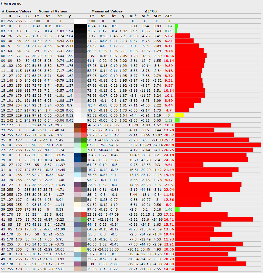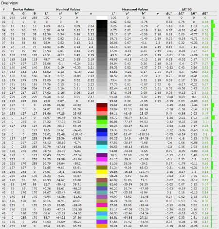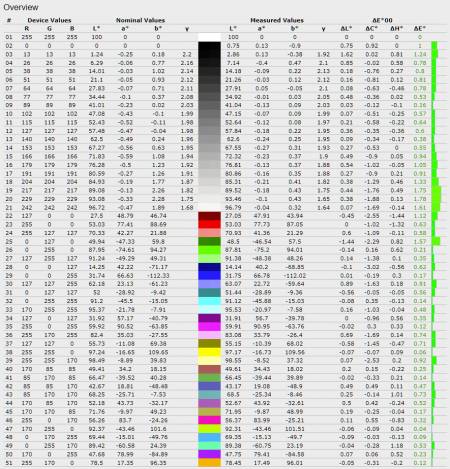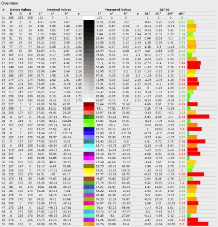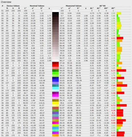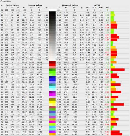 Диаграмма отклонения основных цветов и оттенков от эталонов в откалиброванном профиле