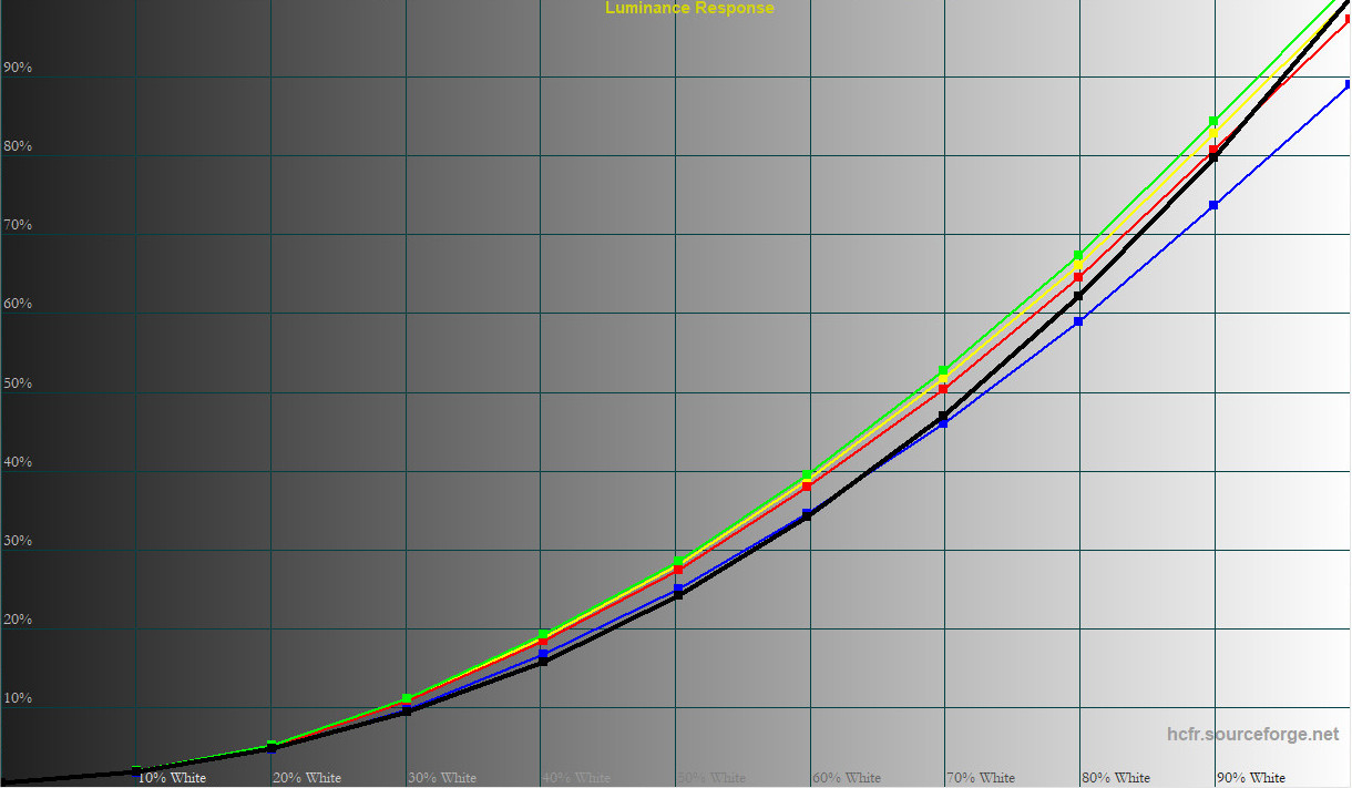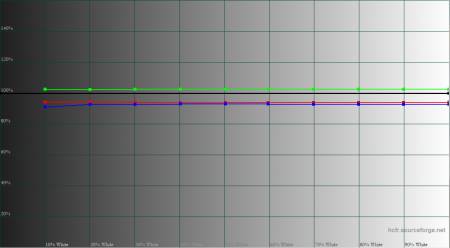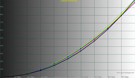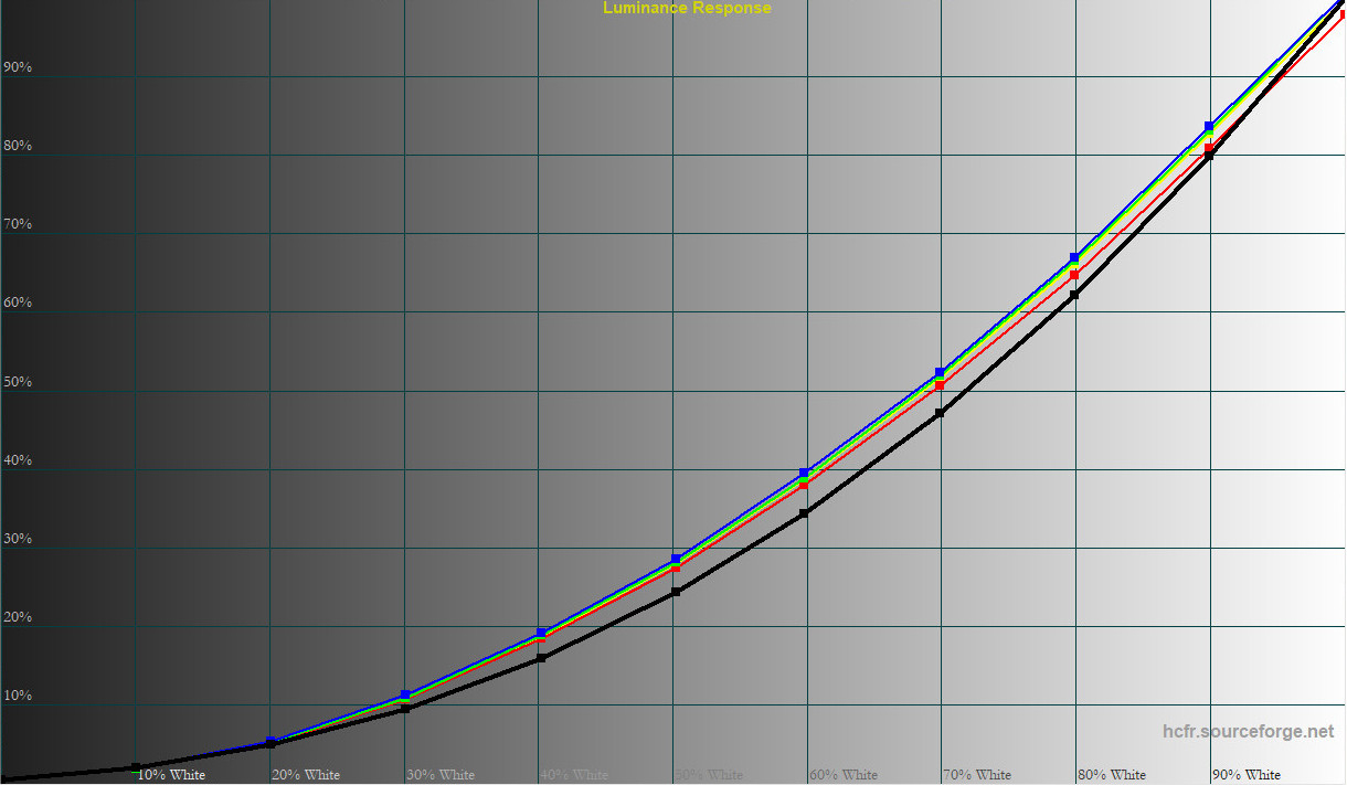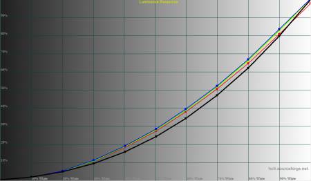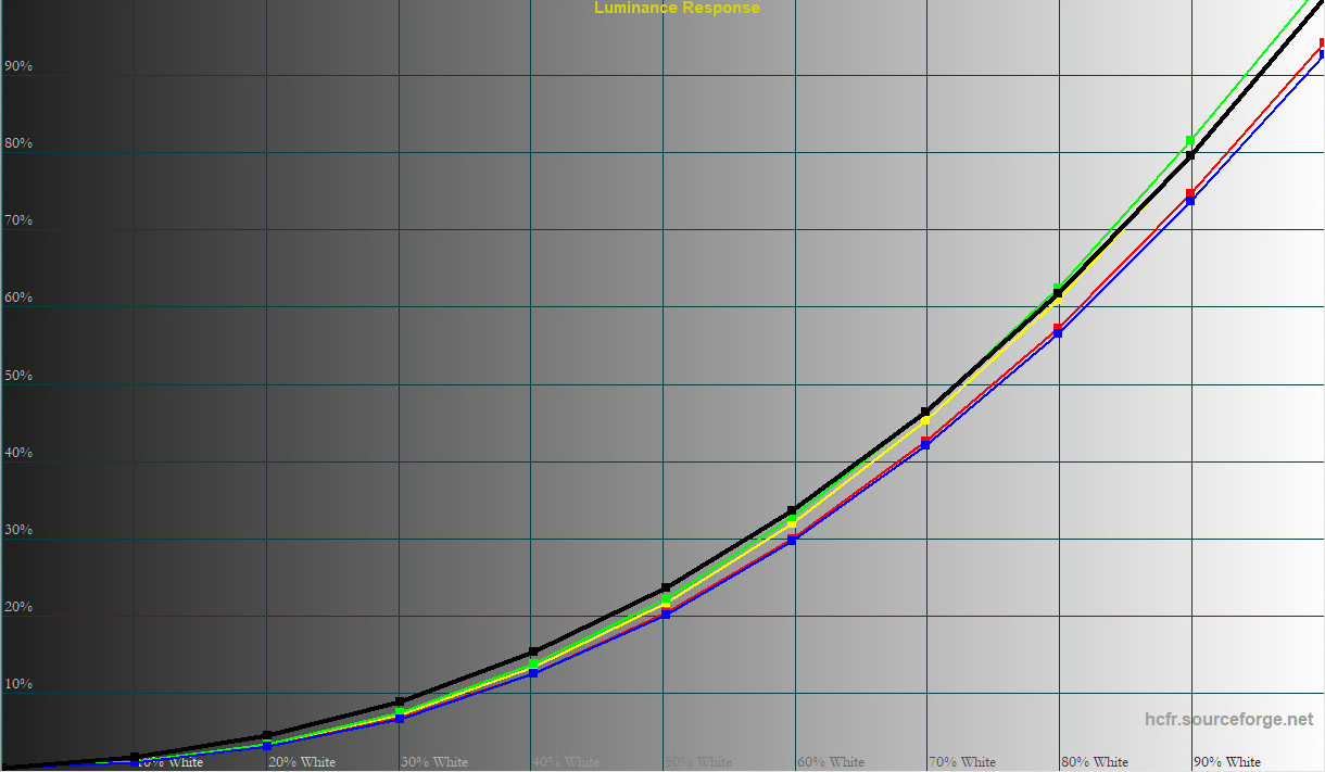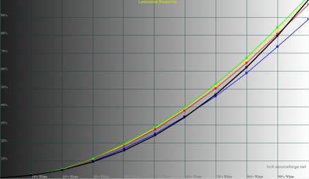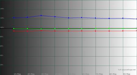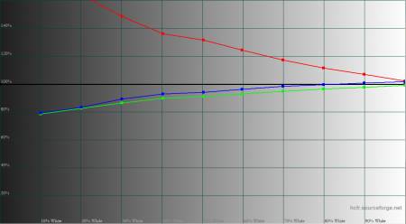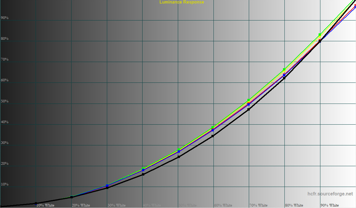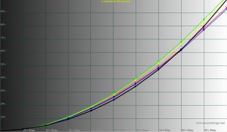 В 7 из 8 режимов работы значение средней гаммы находится в пределах 1,80-1,84, при этом гамма кривые-кривые пресетов расположены выше эталонной пунктирной. В результате наблюдается утрата деталей на светлых участках изображения. Форма гамма кривых далека от референсного значения, а цветовые составляющие средней гаммы не сливаются в одну кривую ни в одном из пресетов.