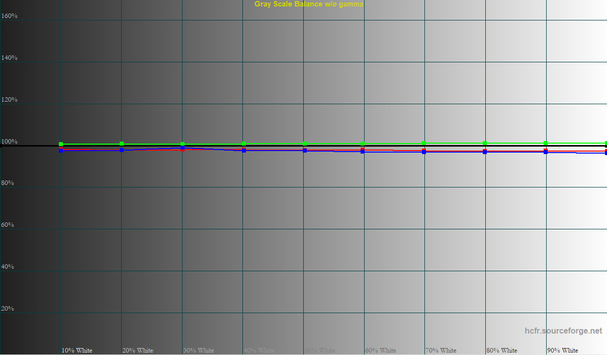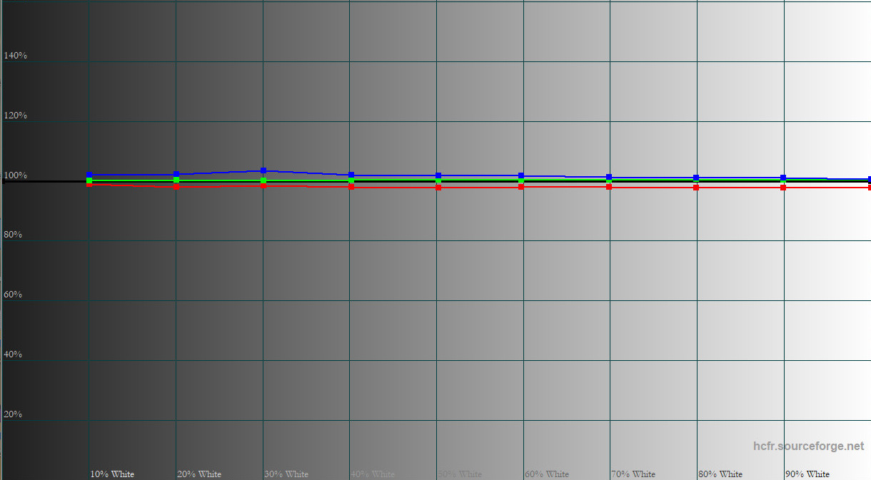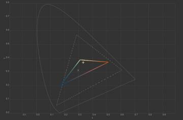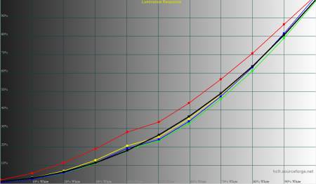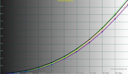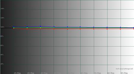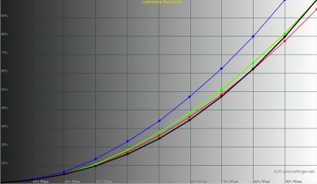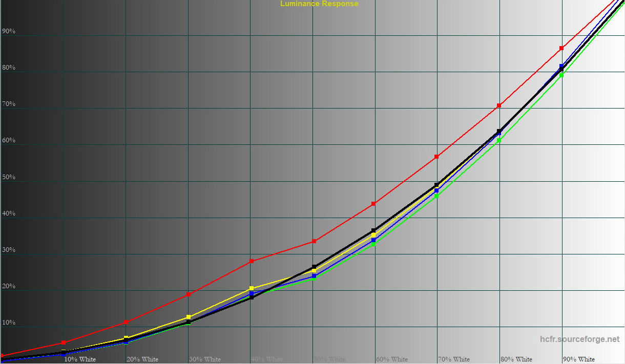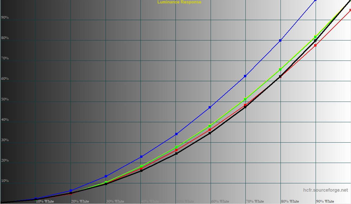 В 7 из 8 режимов работы значение средней гаммы находится в пределах 1,80-1,84, при этом гамма кривые-кривые пресетов расположены выше эталонной пунктирной. В результате наблюдается утрата деталей на светлых участках изображения. Форма гамма кривых далека от референсного значения, а цветовые составляющие средней гаммы не сливаются в одну кривую ни в одном из пресетов.