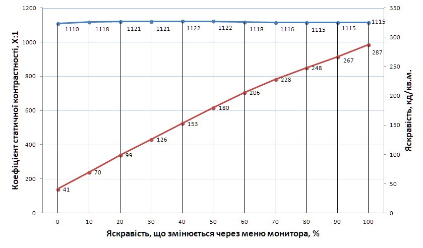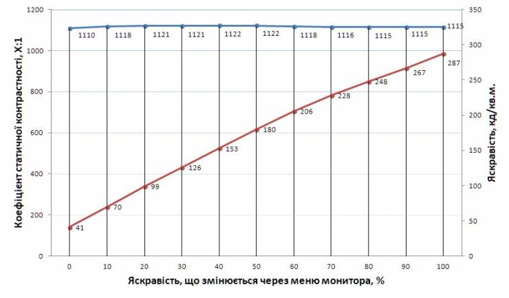 Высокий диапазон изменения яркости сопровождается стабильной контрастностью на уровне 1110:1-1122:1, при заявленных 1000:1. Минимальная яркость составляет 41 кд/м², что позволяет комфортно работать вечером при наличии фонового освещения. Максимальная яркость этого режима — 287 кд/м², что несколько ниже заявленных 300 кд/м², впрочем, достаточная для работы даже в яркий солнечный день.