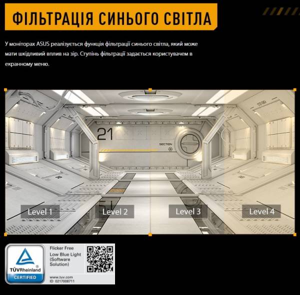 Фильтрация синего света позволяет гибко настраивать уровень яркости синей составляющей в видимом спектре – через меню или DisplayWidget Center. Это снижает нагрузку на глаза при длительном использовании.