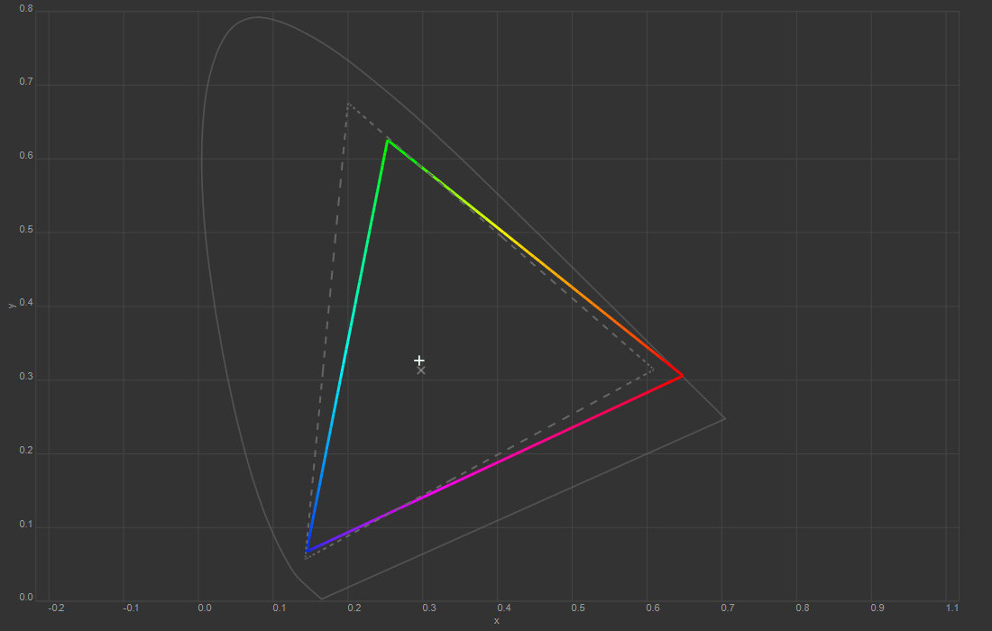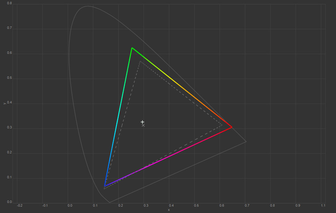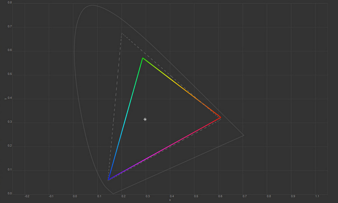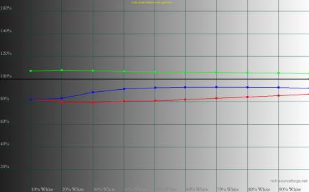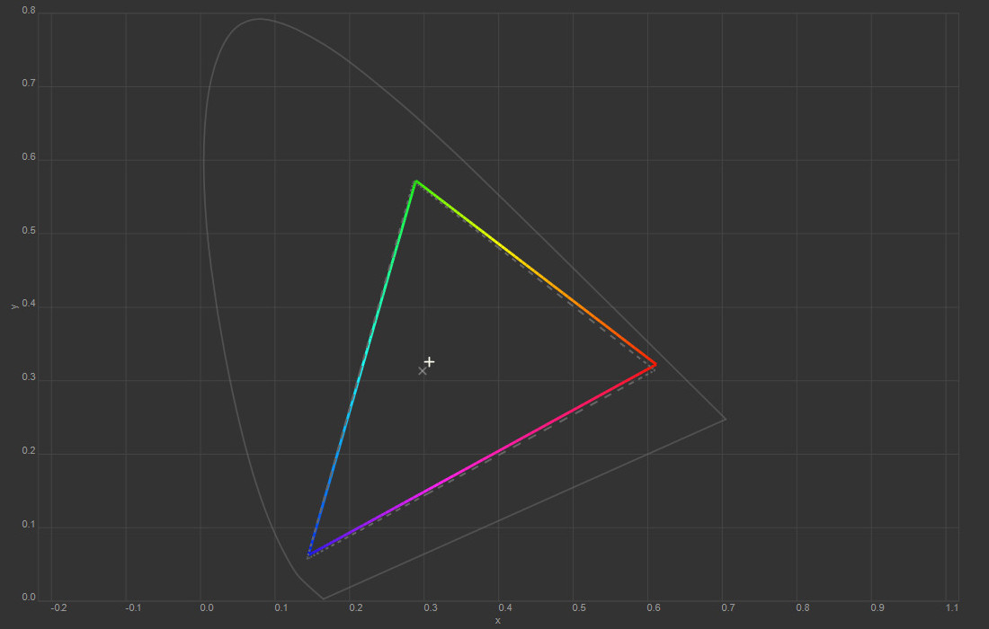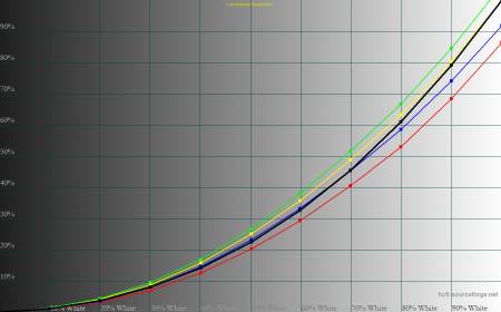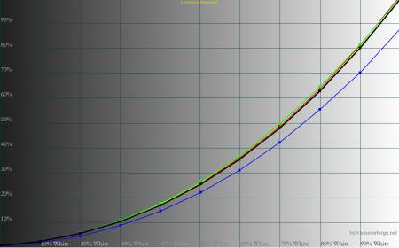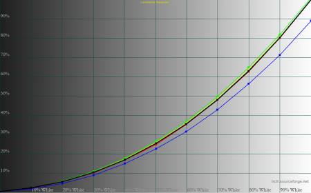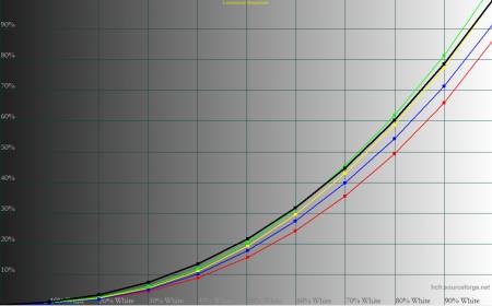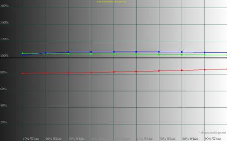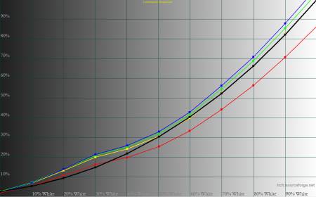 В то же время, синюю составляющую гамма-кривой удалось приблизить к референсному значению 2,2, а уровни RGB стали немного более равномерными, без глубоких провалов. Это локальные улучшения, которые не изменяют общую картину: VA-матрица имеет аппаратные ограничения, и sRGB-прессет не позволяет достичь референсной точности без аппаратного LUT-корректора.