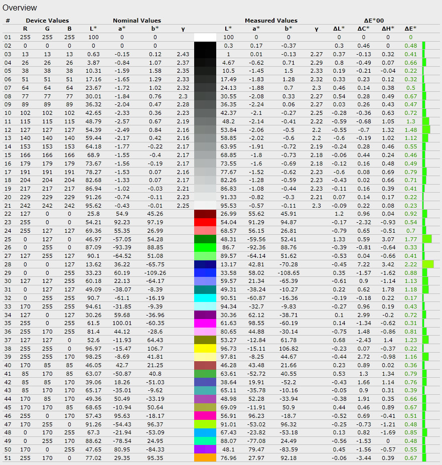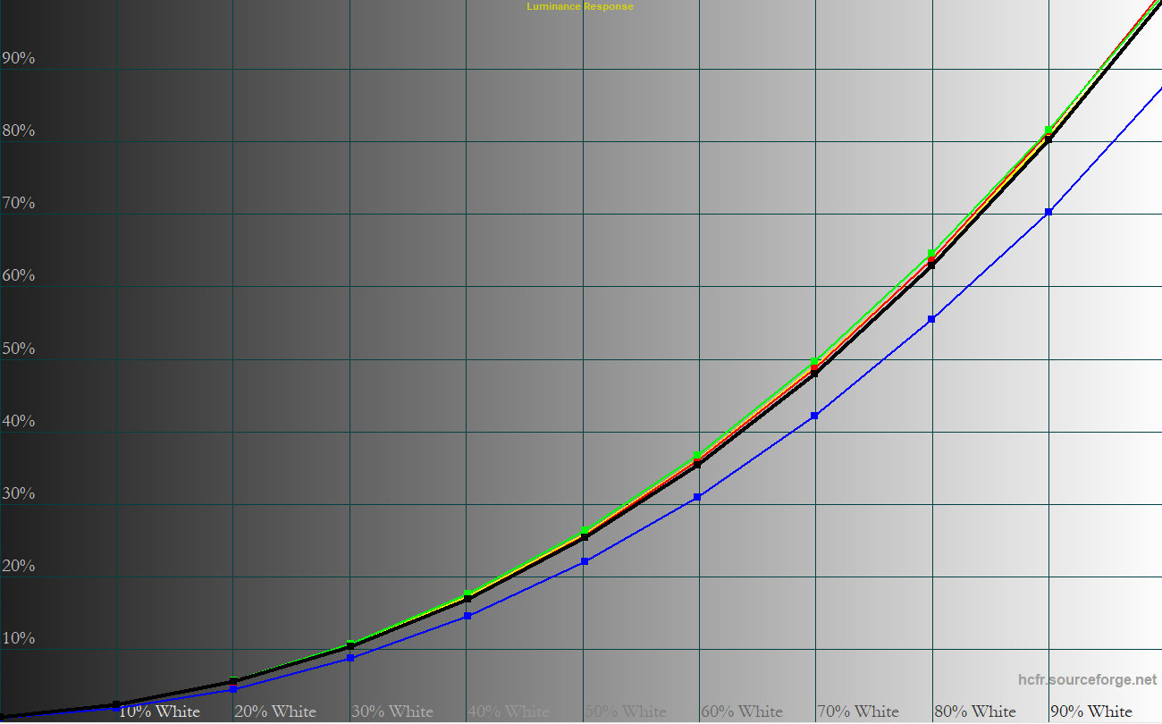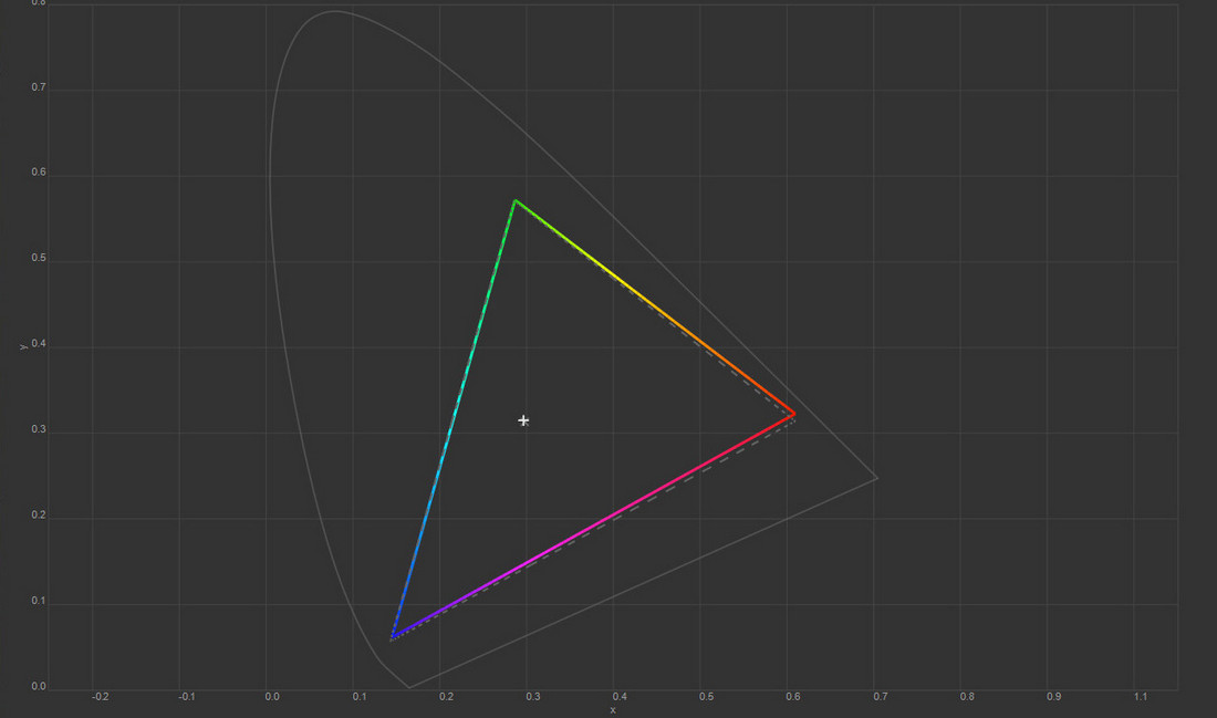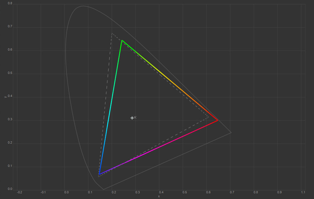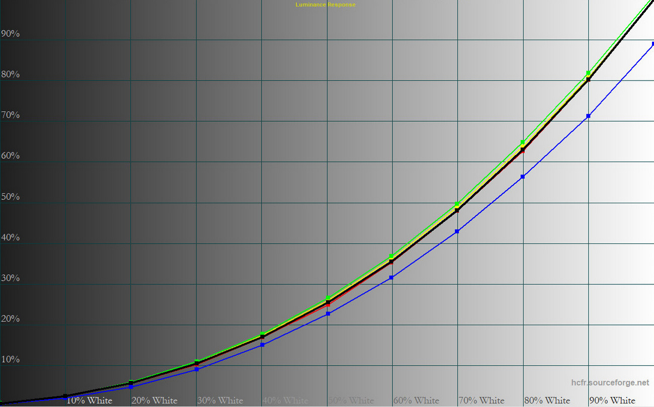 В то же время, синюю составляющую гамма-кривой удалось приблизить к референсному значению 2,2, а уровни RGB стали немного более равномерными, без глубоких провалов. Это локальные улучшения, которые не изменяют общую картину: VA-матрица имеет аппаратные ограничения, и sRGB-прессет не позволяет достичь референсной точности без аппаратного LUT-корректора.