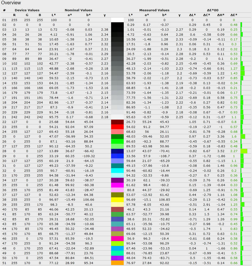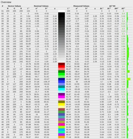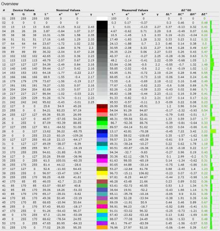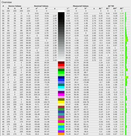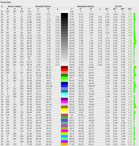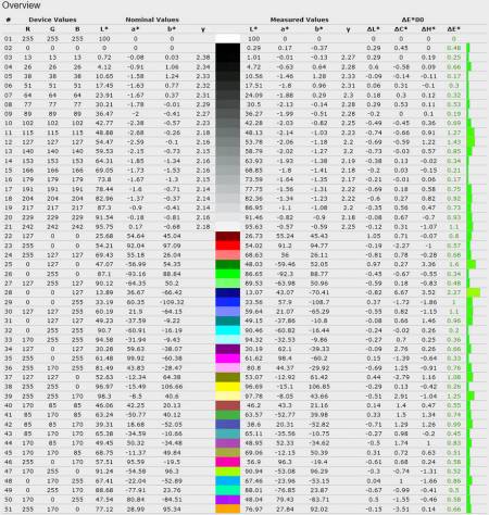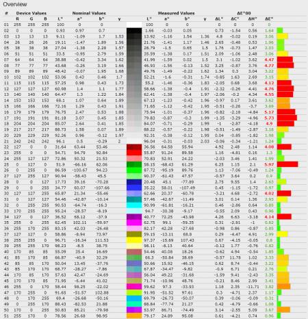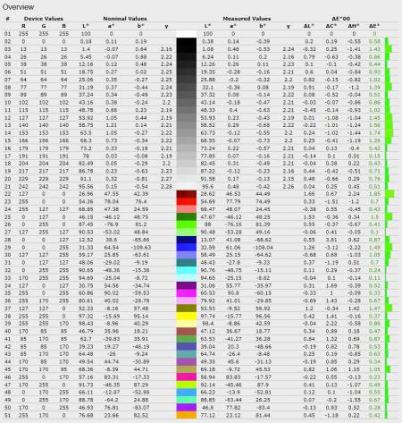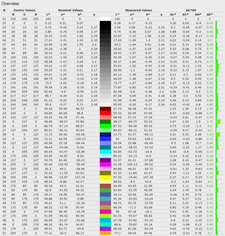 Диаграмма отклонения основных цветов и оттенков от эталонов в откалиброванном профиле