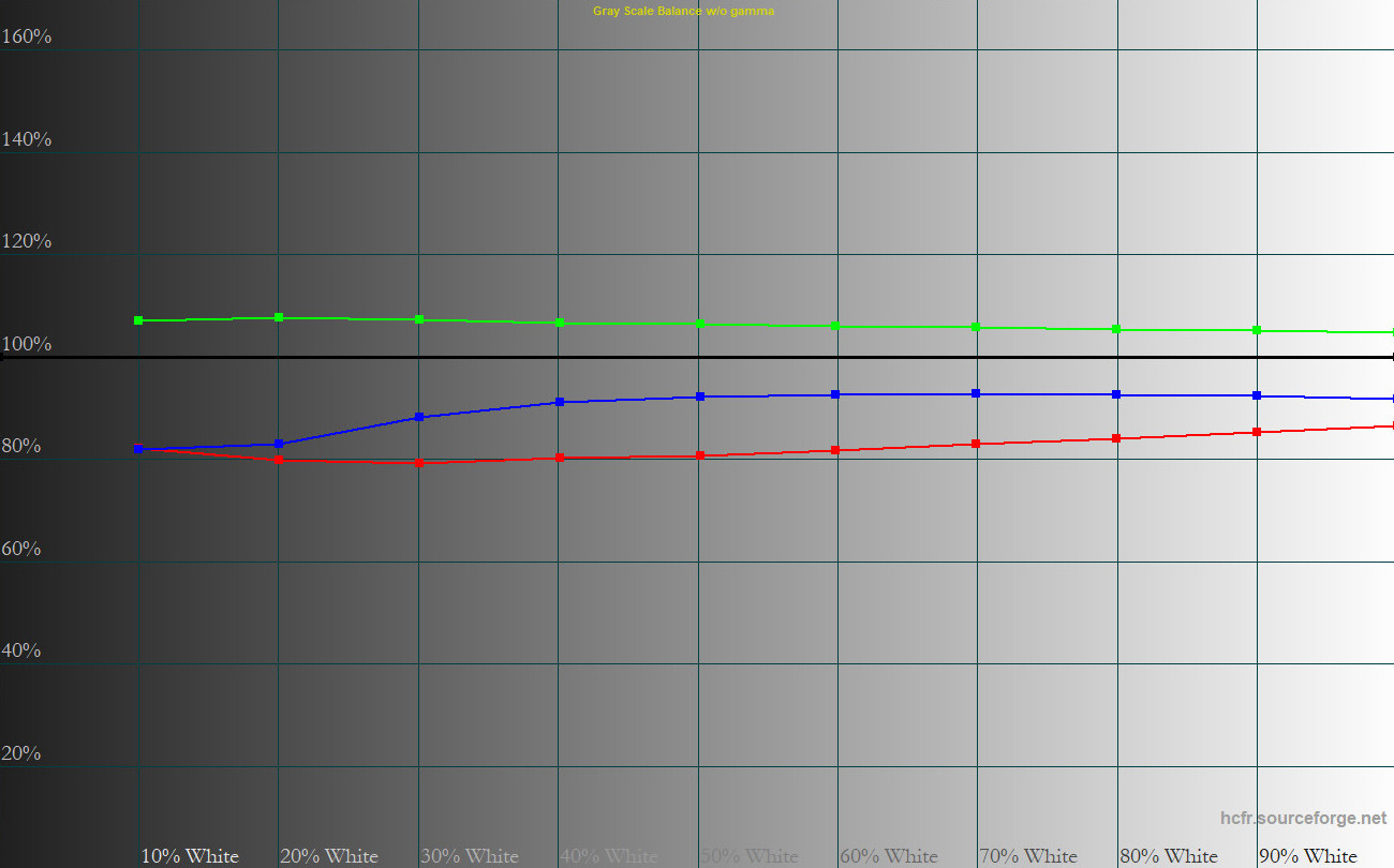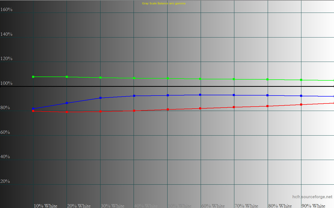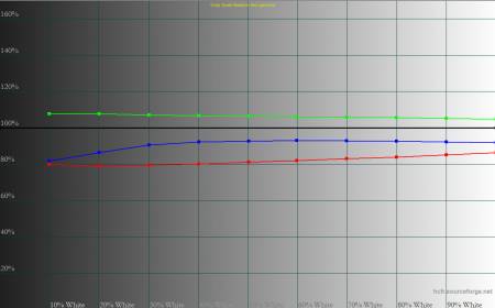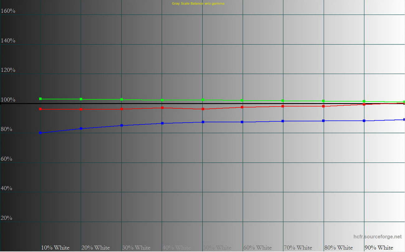 Как видим, заводские пресеты не обеспечивают полного равновесия RGB. Это типично для VA-матриц: они редко удерживают уровни каналов стабильно, особенно на темных оттенках. Из-за особенностей структуры VA часто «проседает» по красному или синему, а заводские режимы больше ориентированы на яркую картинку, чем на точность.