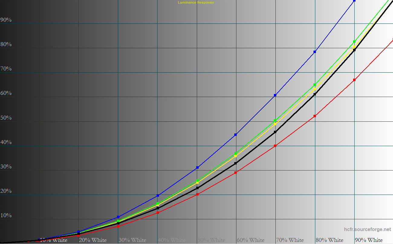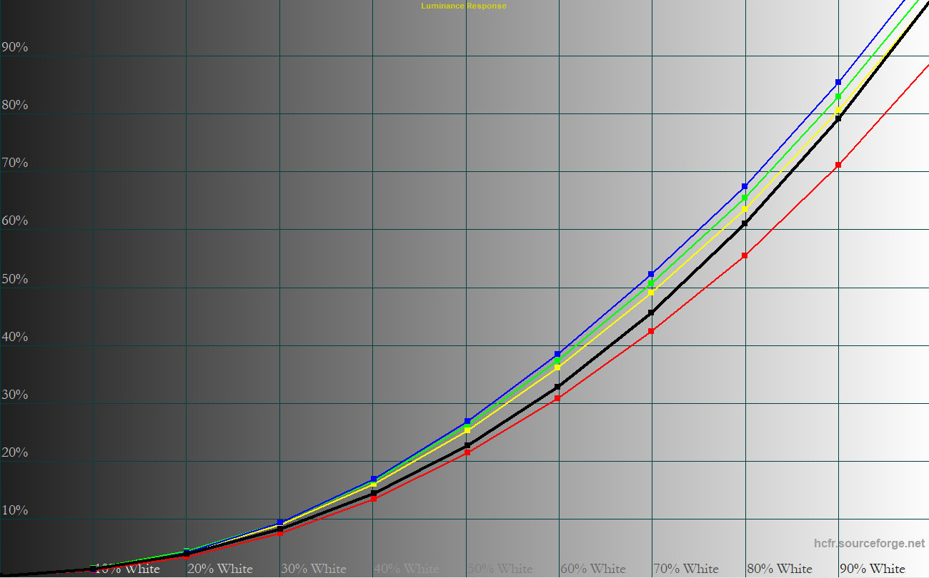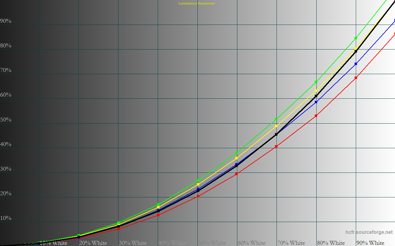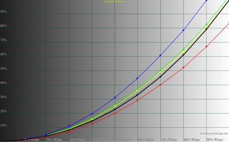 Форма кривых далека от референсной, а цветовые составляющие средней гаммы не сливаются в одну линию — особенно в профилях Cinema, RTS/RPG, FPS и User. Ближайшими к эталону выглядят Racing и sRGB, но даже они имеют отклонения по форме и синхронности каналов.