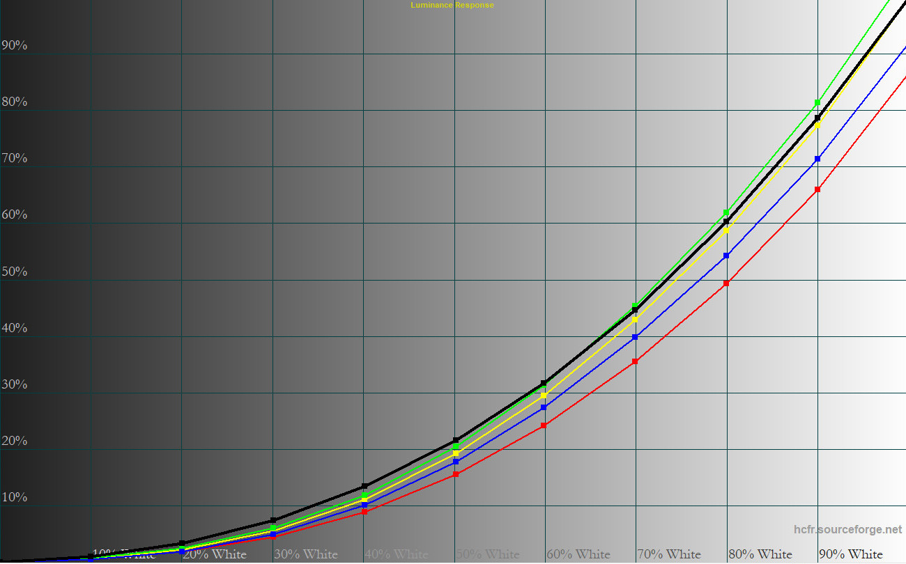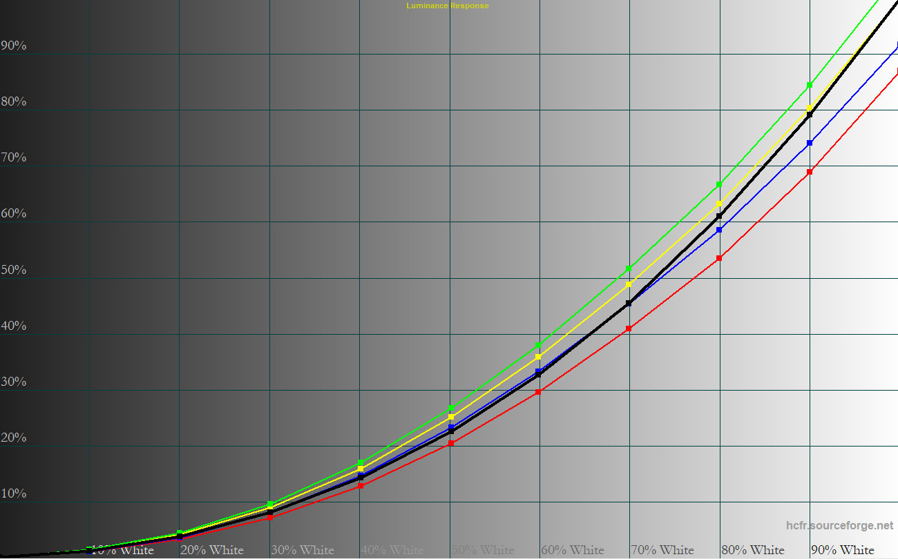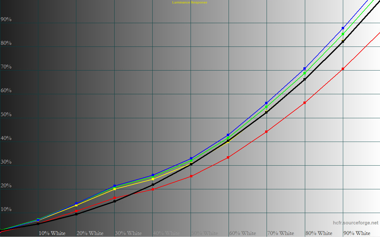 Форма кривых далека от референсной, а цветовые составляющие средней гаммы не сливаются в одну линию — особенно в профилях Cinema, RTS/RPG, FPS и User. Ближайшими к эталону выглядят Racing и sRGB, но даже они имеют отклонения по форме и синхронности каналов.