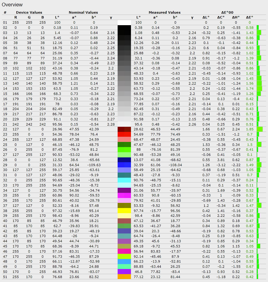 Другие параметры — охват sRGB (95,3%), объем (96,9%), охват Adobe RGB (66,6%) несколько уменьшились. Среднее отклонение ∆E*94 выросло от 0,65 до 0,75, максимальное – от 1,62 до 1,85, но оба показателя остаются в пределах профессиональных нормативов. Гамма осталась на уровне 1,89, с характерным смещением кривых выше эталонной.
