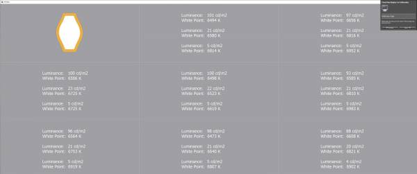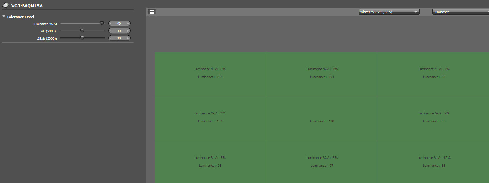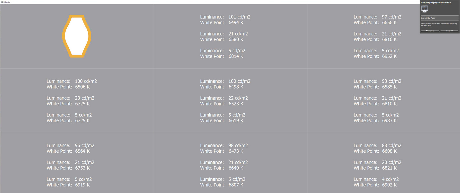 Максимальное отклонение яркости по отношению к центральному участку составляло 6 кд/м², или 6%, что является отличным показателем для VA-панели с изогнутой геометрией.