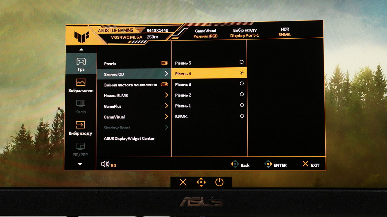 ASUS TUF Gaming VG34WQML5A оснащен Fast VA-матрицей с заявленным временем отклика 1 мс G2G, а также минимальным значением 0,5 мс, достигнутым при активации ELMB. Частота обновления составляет до 250 Гц — и это не пустой маркетинг: в динамике монитор действительно ведет себя четко, особенно в диапазоне 120–250 FPS. Важно отметить, что режим 250 Гц реализован как разгон и доступен только через DisplayPort.