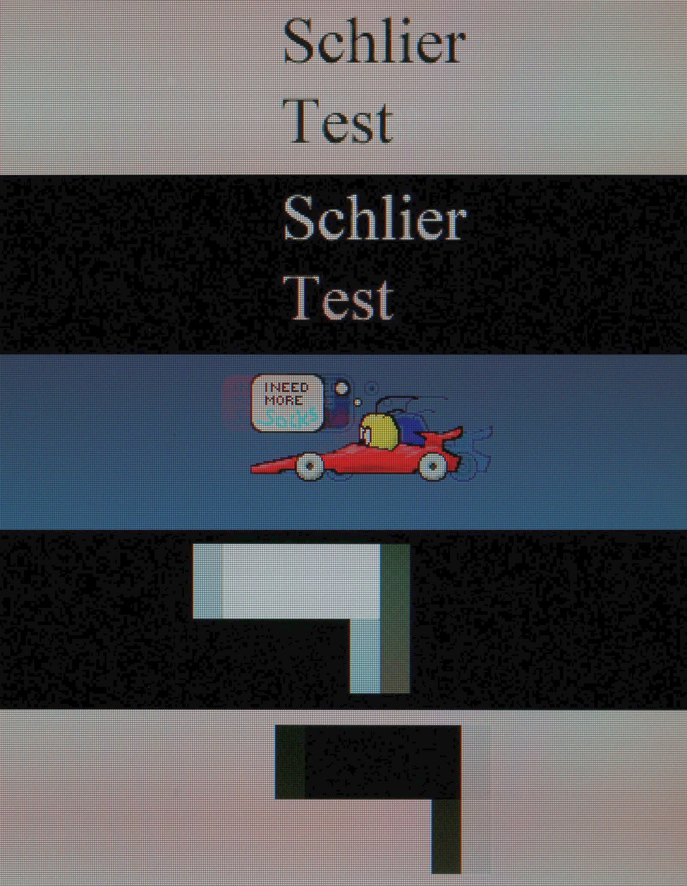 Во время тестирования Schlieren-тестом были обнаружены заметные шлейфы на темных переходах, а также легкие артефакты разгона – особенно в зоне с прямоугольниками и на тесте с машинкой. Это типичный сценарий для VA-панелей, которые не славятся быстродействием на темных градациях. Впрочем, за последние два года VA-матрицы существенно прибавили в скорости: если раньше потолок был 165–180 Гц, то теперь большинство переходов обрабатываются быстрее, с меньшей инерцией.