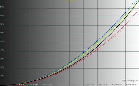 В шести из семи протестированных режимов среднее значение гаммы находится в пределах 1,89–1,99, что ниже эталонного уровня 2,2. Гамма-кривые стабильно проходят выше пунктирной линии вследствие чего наблюдается потеря деталей в светлых участках изображения. Профиль «FPS» – самый светлый, со средней гаммой 1,56. Профиль «RTS/RPG» — единственный, где гамма превышает норму (2,35), что приводит к затемнению полутонов и потере детализации в тенях.