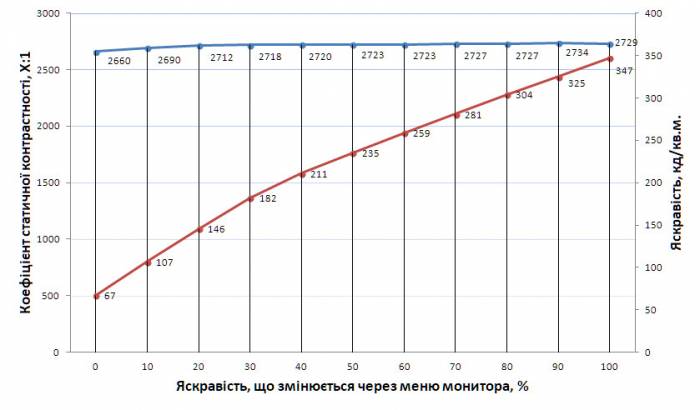 Высокий диапазон изменения яркости сопровождается стабильной контрастностью на уровне 2650:1–2734:1, что приближается к реальным пределам быстрых VA-панелей. Заявленные 4000:1 — это маркетинговое значение, практически не встречающееся в моделях с быстрой матрицей и адекватной яркостью. В этом случае контрастность стабильная по всему диапазону без провалов на низких уровнях яркости.