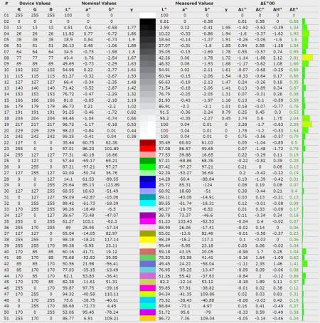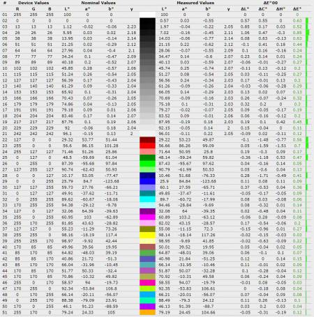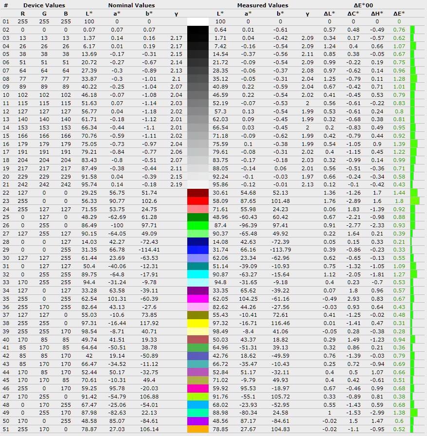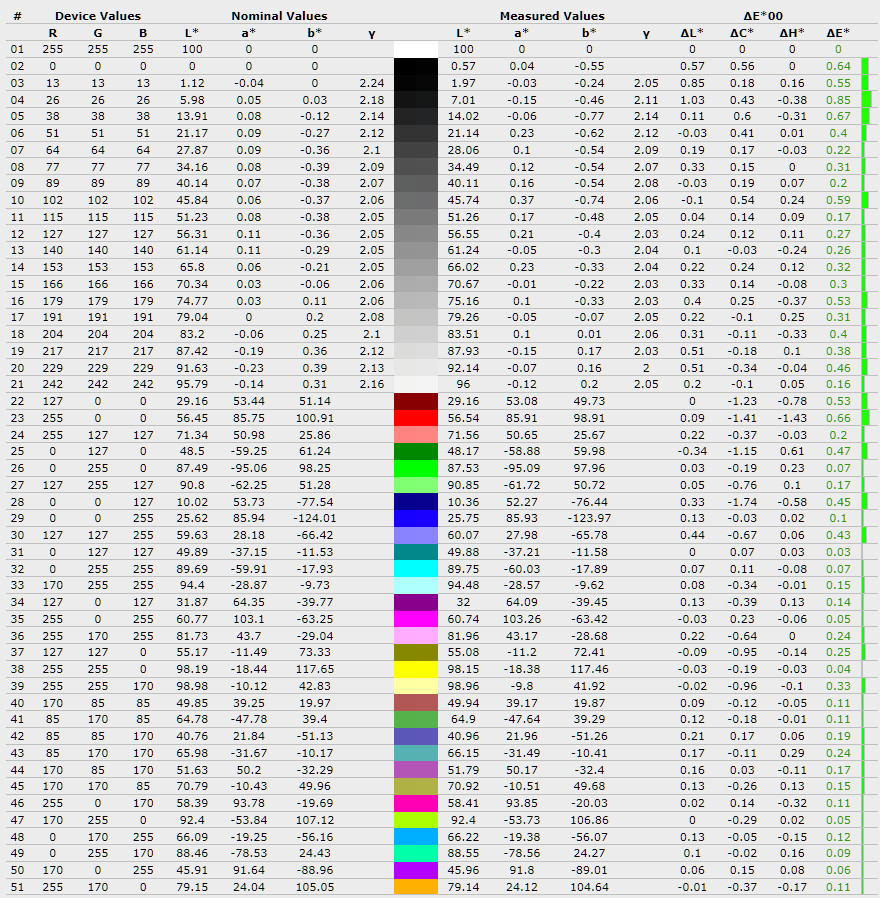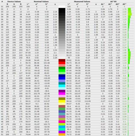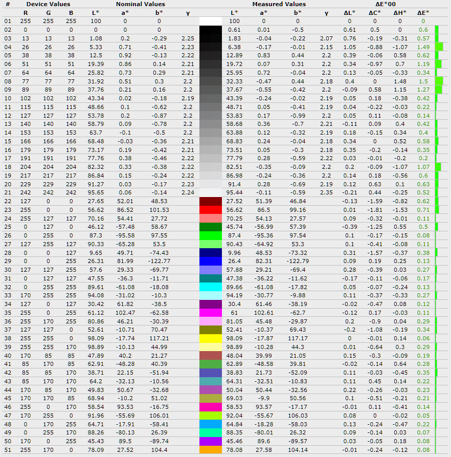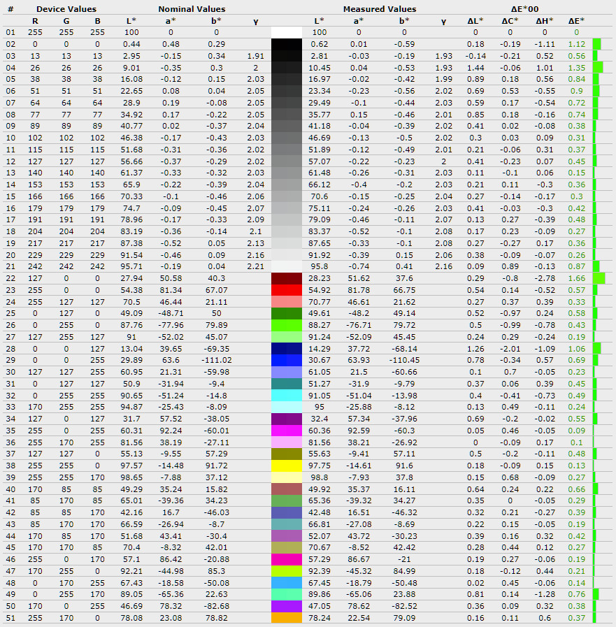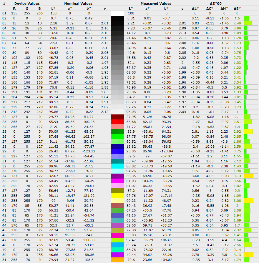 Среднее отклонение ∆E*00 поднялось от 0,27 до 0,39, а максимальное выросло от 0,85 до 1,5, что означает появление более заметных отклонений в некоторых оттенках. Средняя гамма осталась на уровне 1,85, без существенных изменений и все еще ниже эталонных 2,2.