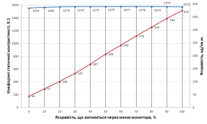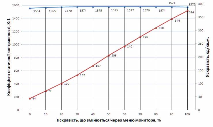 Контрастность остается стабильной на всем диапазоне – от 1554:1 до 1576:1. Это существенно превышает заявленные 1000:1 почти на 50%. Кривая контрастности практически прямая, без провалов на низких уровнях яркости, что свидетельствует о качественной реализации аппаратной регулировки без потери глубины черного.