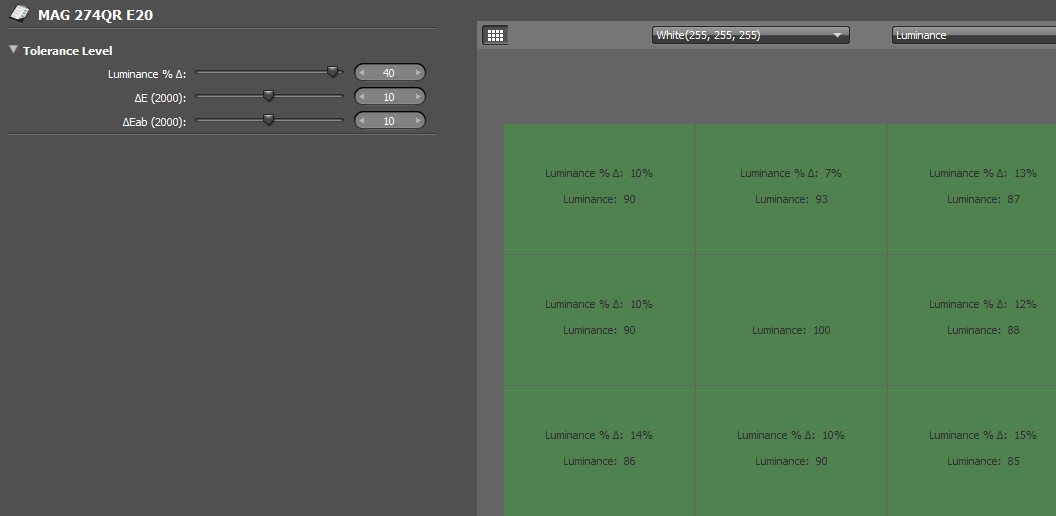 При ручной регулировке в OSD диапазон яркости составляет от ~44 до ~374 кд/м². Минимальное значение не слишком низкое, поэтому для работы в темноте желательно использовать его вместе с фоновой подсветкой стены позади монитора. Однако максимальная яркость однозначно позволяет комфортно работать даже в яркий солнечный день.