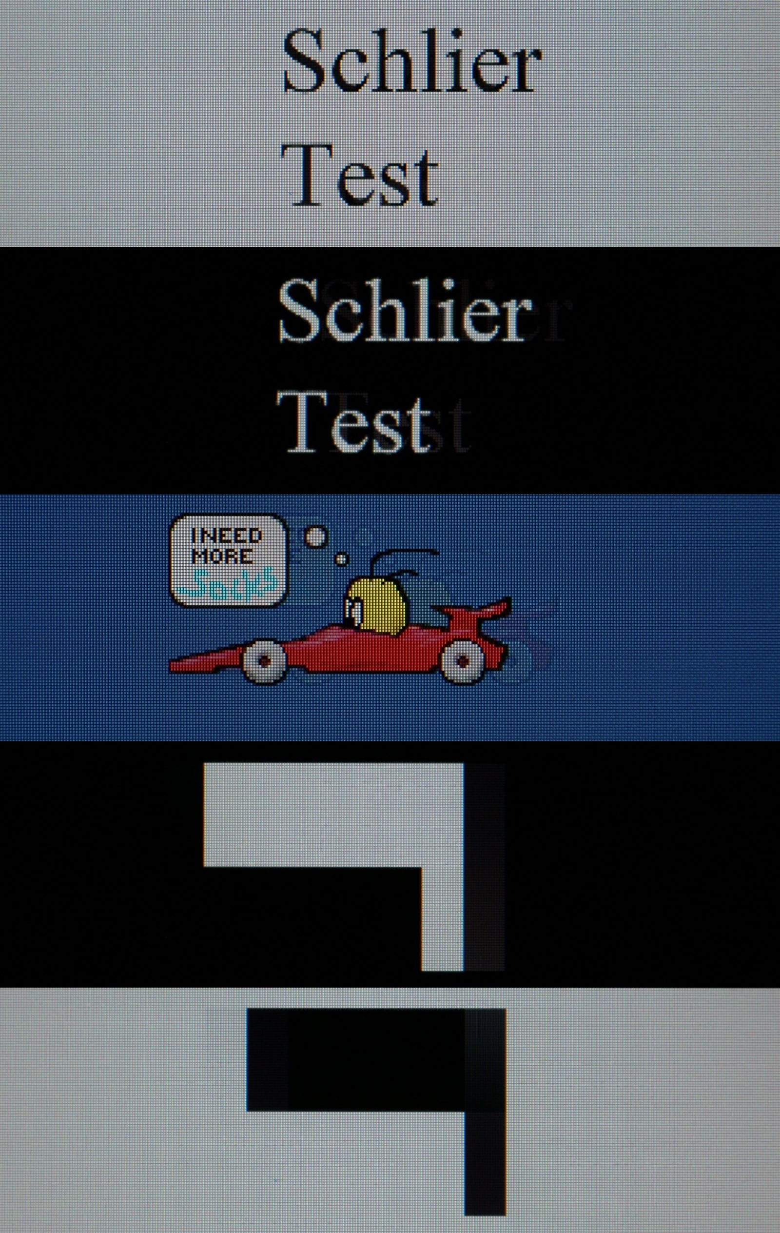 В динамике монитор ведет себя четко, особенно в диапазоне от 120 до 200Гц, где плавность движения ощущается лучше. Во время теста Schlier текстовые блоки остаются читабельными, без критических шлейфов, а цветной объект с машинкой демонстрирует лишь легкие артефакты разгона. На темных переходах видна небольшая инерция, но без значительных задержек или инверсий. Такое поведение соответствует современному уровню IPS-панелей: остаточные эффекты умеренные и не влияют на комфорт в динамических сценах.