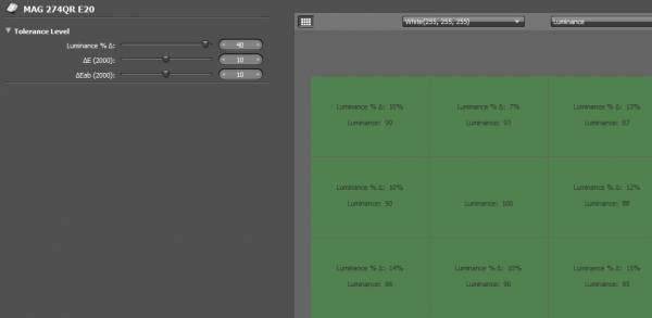 Отклонение температуры точки белого от центрального участка составляет от -199 до +319 K, что вкладывается в допустимые пределы ±300-350 K. Самое большое снижение зафиксировано в центральном нижнем секторе, тогда как максимальное повышение - в правом верхнем. В общем, картинка остается стабильной, без критических смещений оттенков, а плавный характер изменений не создает дискомфорта. Следует учитывать, что результаты касаются конкретного экземпляра монитора, и в других образцах возможны индивидуальные отличия.