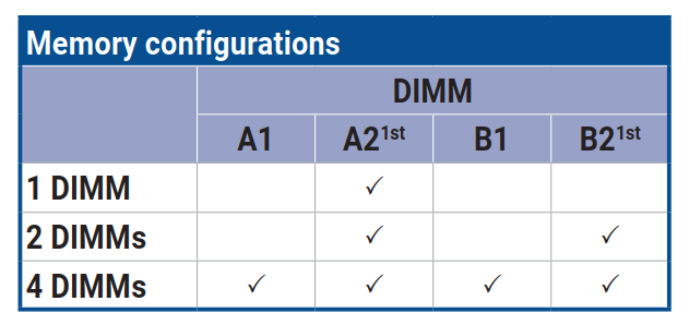 Согласно руководству пользователя, для двух модулей памяти традиционно приоритетными являются слоты A2 и B2, а для одного — A2.