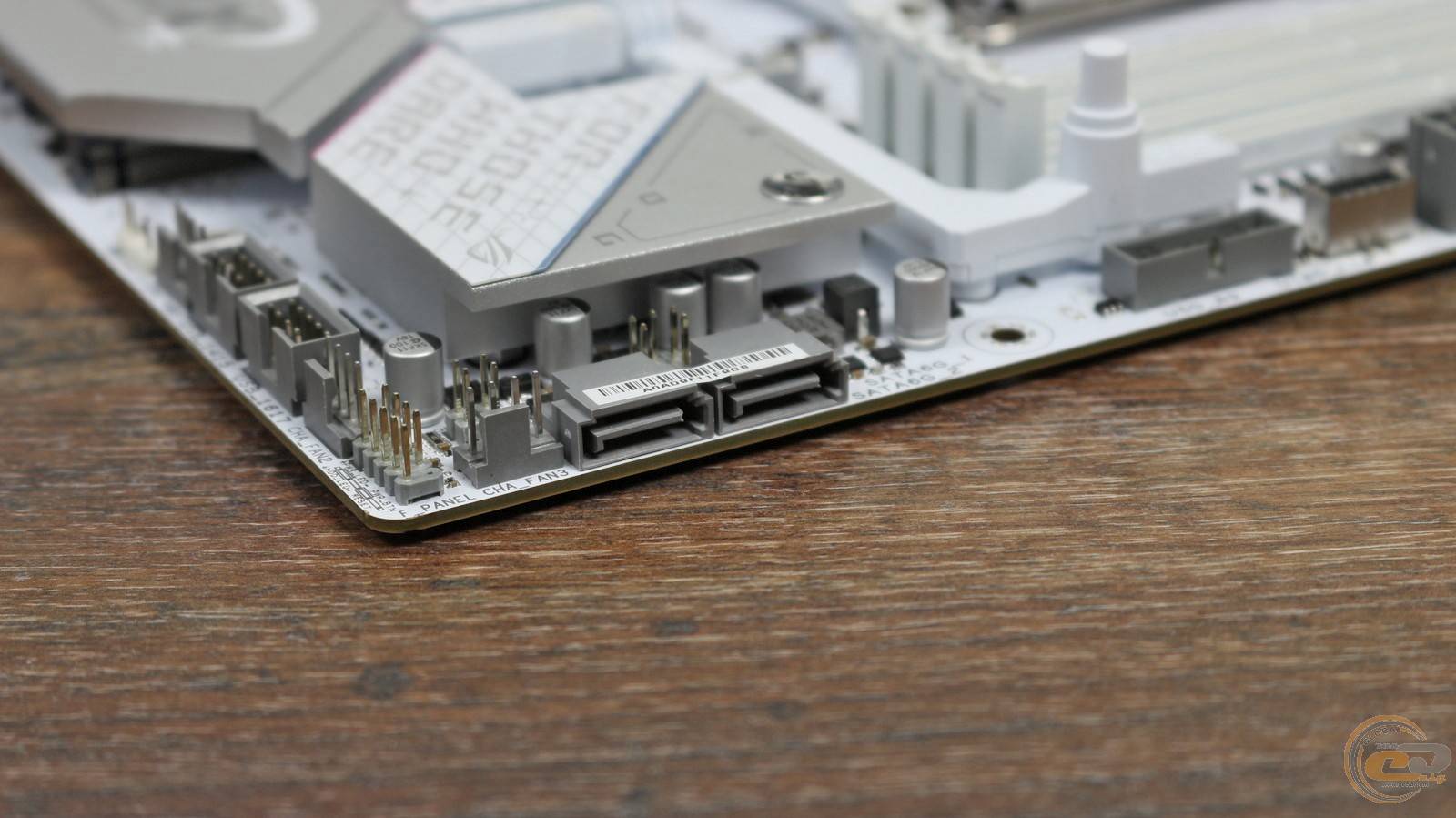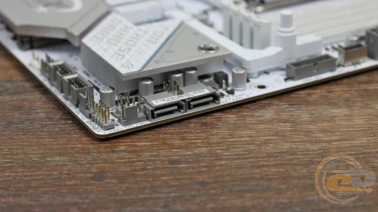 Еще ниже вдоль правого края виден один разъем для корпусного вентилятора и пара горизонтальных портов SATA 6 Гбит/с. И если у той же ASUS B850M MAX GAMING WIFI еще два разъема SATA распаяны вдоль нижнего края платы, то на тестируемом устройстве дополнительных таких элементов, к сожалению, нет.